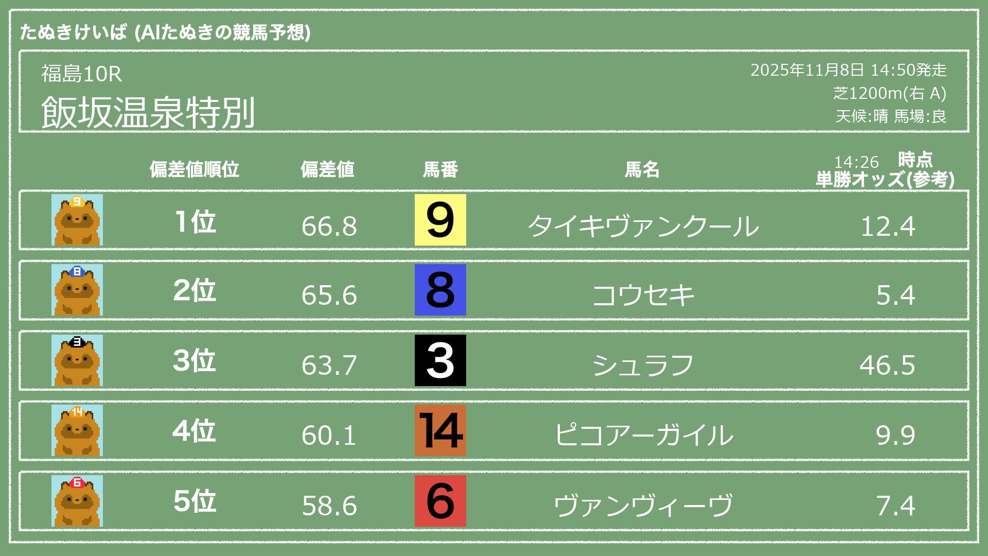 うちのたぬき(AI)による競馬予想です。レースごとに各馬の能力を偏差値で表現してみました。