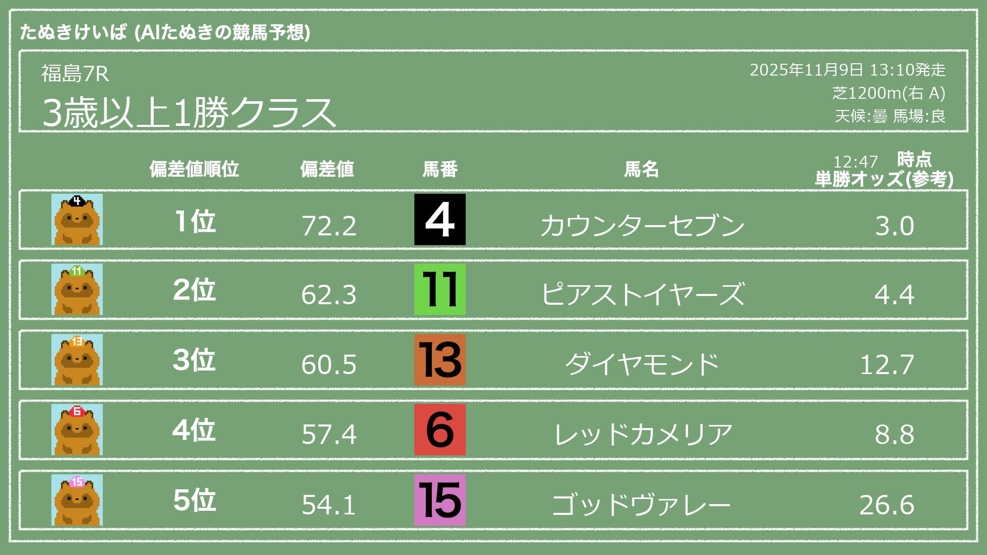 うちのたぬき(AI)による競馬予想です。レースごとに各馬の能力を偏差値で表現してみました。