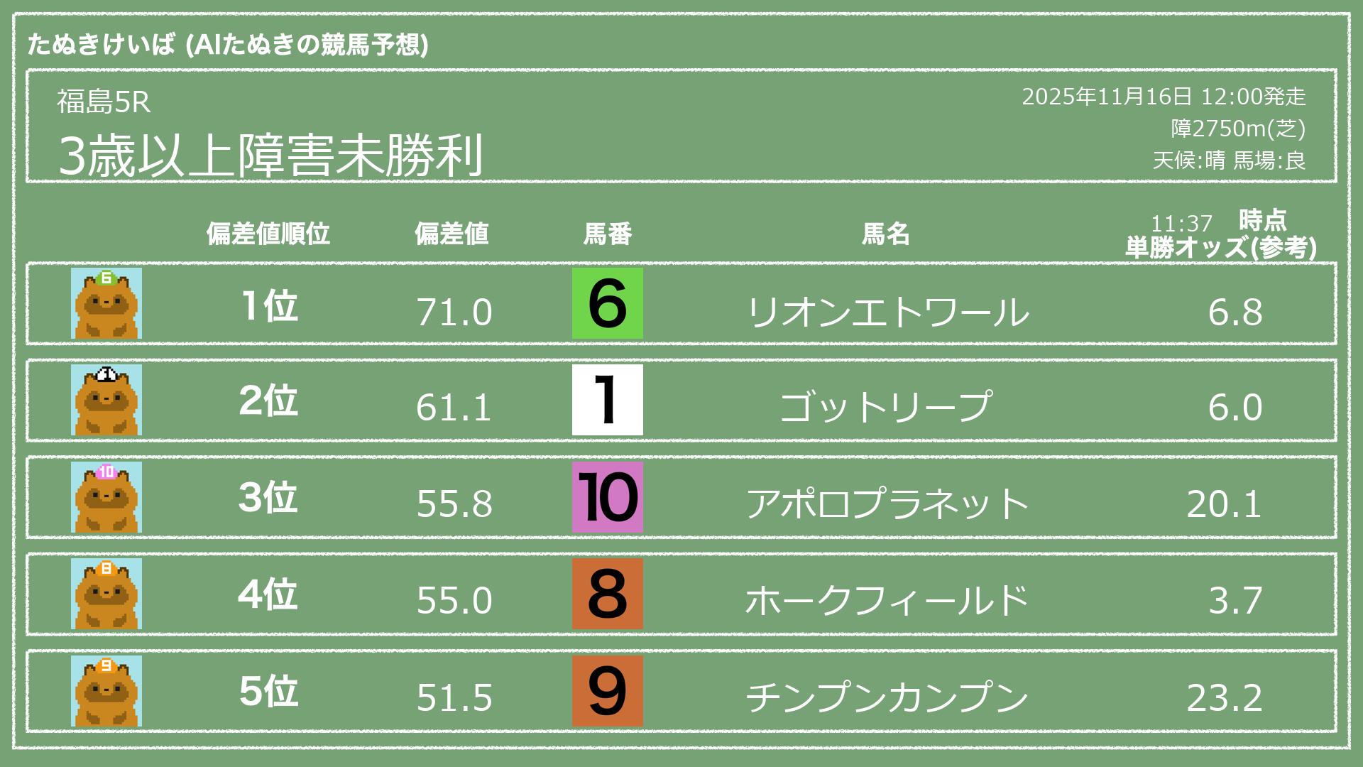うちのたぬき(AI)による競馬予想です。レースごとに各馬の能力を偏差値で表現してみました。