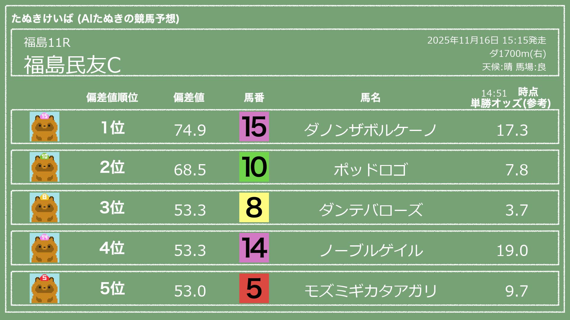 うちのたぬき(AI)による競馬予想です。レースごとに各馬の能力を偏差値で表現してみました。