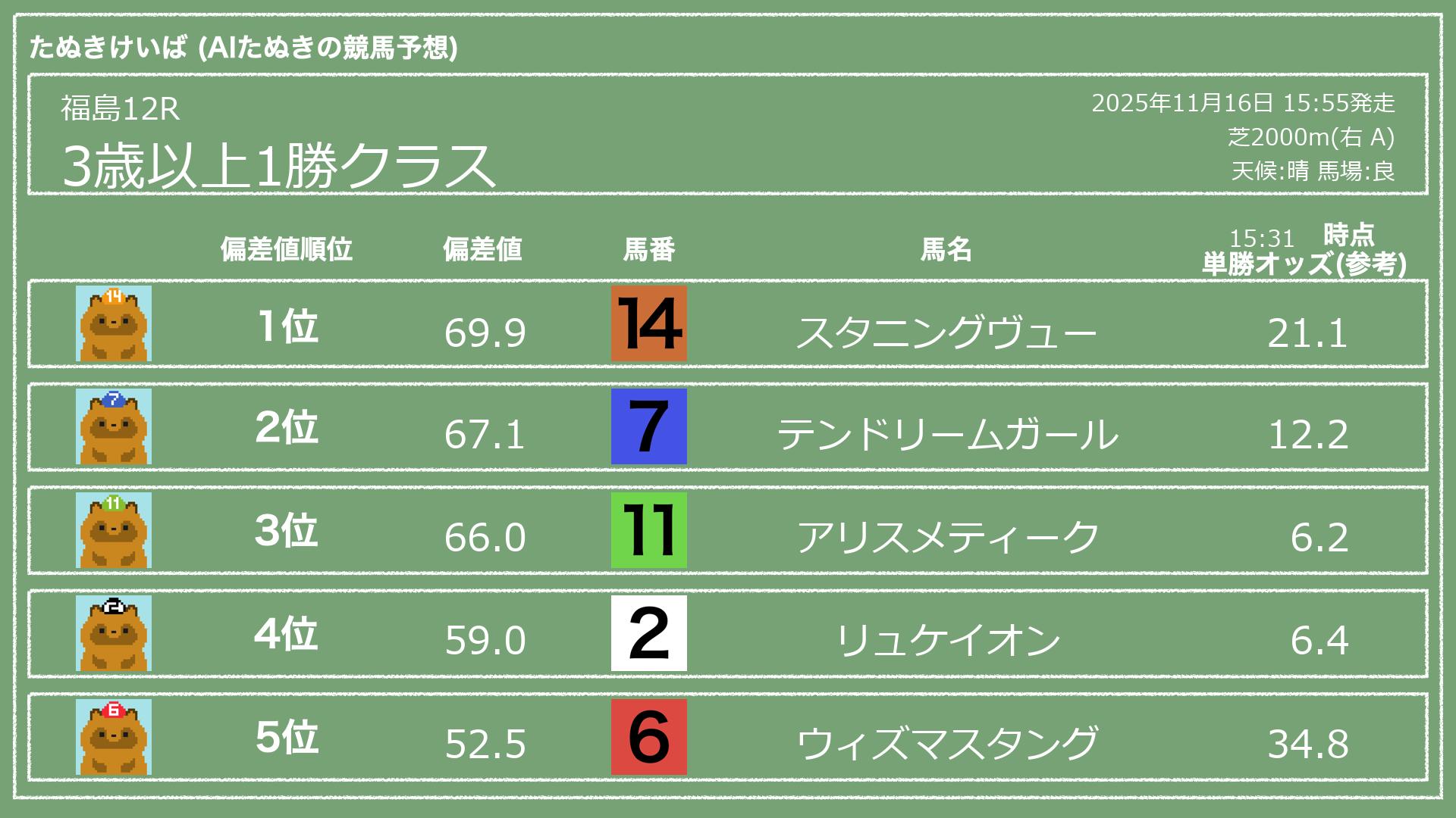 うちのたぬき(AI)による競馬予想です。レースごとに各馬の能力を偏差値で表現してみました。