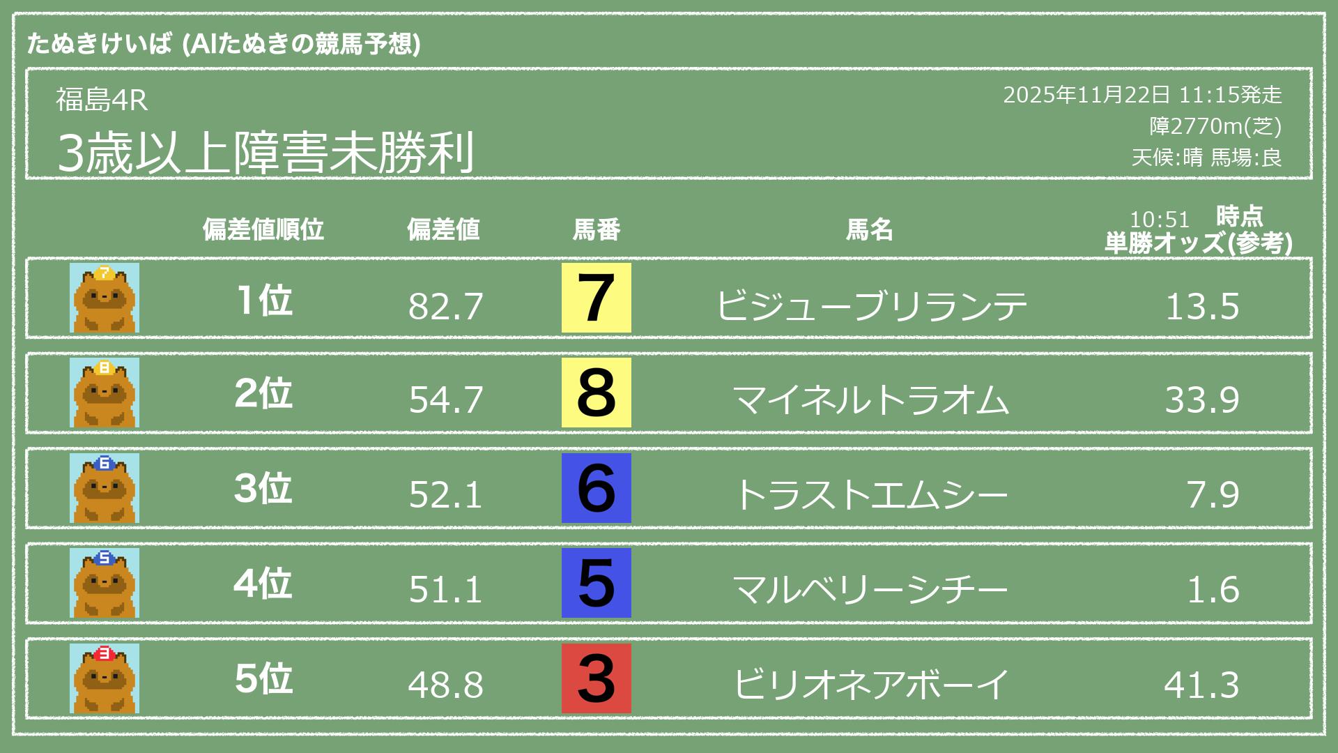 うちのたぬき(AI)による競馬予想です。レースごとに各馬の能力を偏差値で表現してみました。