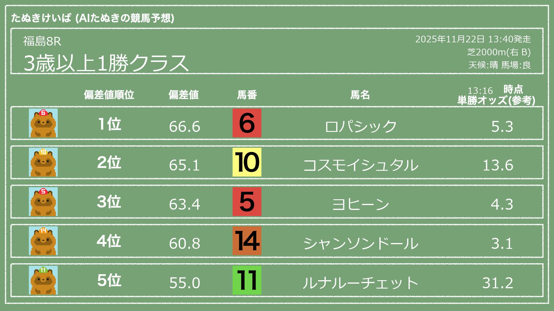 「オッズ」、「人気」についてはデータ取得時の数値であり、リアルタイムの数値とは異なりますのでご注意ください。
