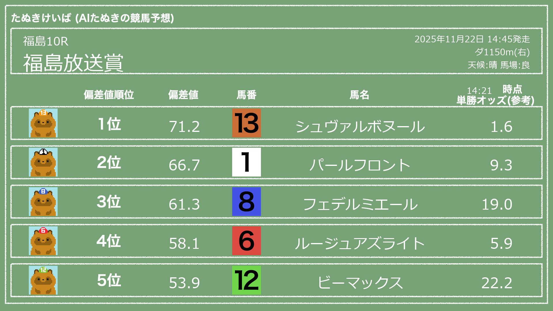 うちのたぬき(AI)による競馬予想です。レースごとに各馬の能力を偏差値で表現してみました。
