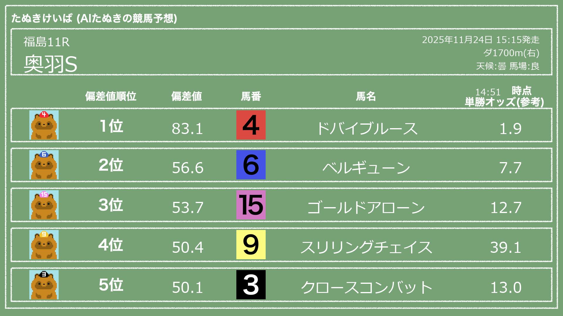 うちのたぬき(AI)による競馬予想です。レースごとに各馬の能力を偏差値で表現してみました。