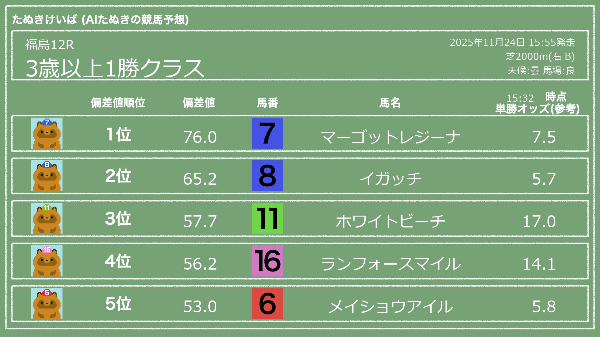 うちのたぬき(AI)による競馬予想です。レースごとに各馬の能力を偏差値で表現してみました。