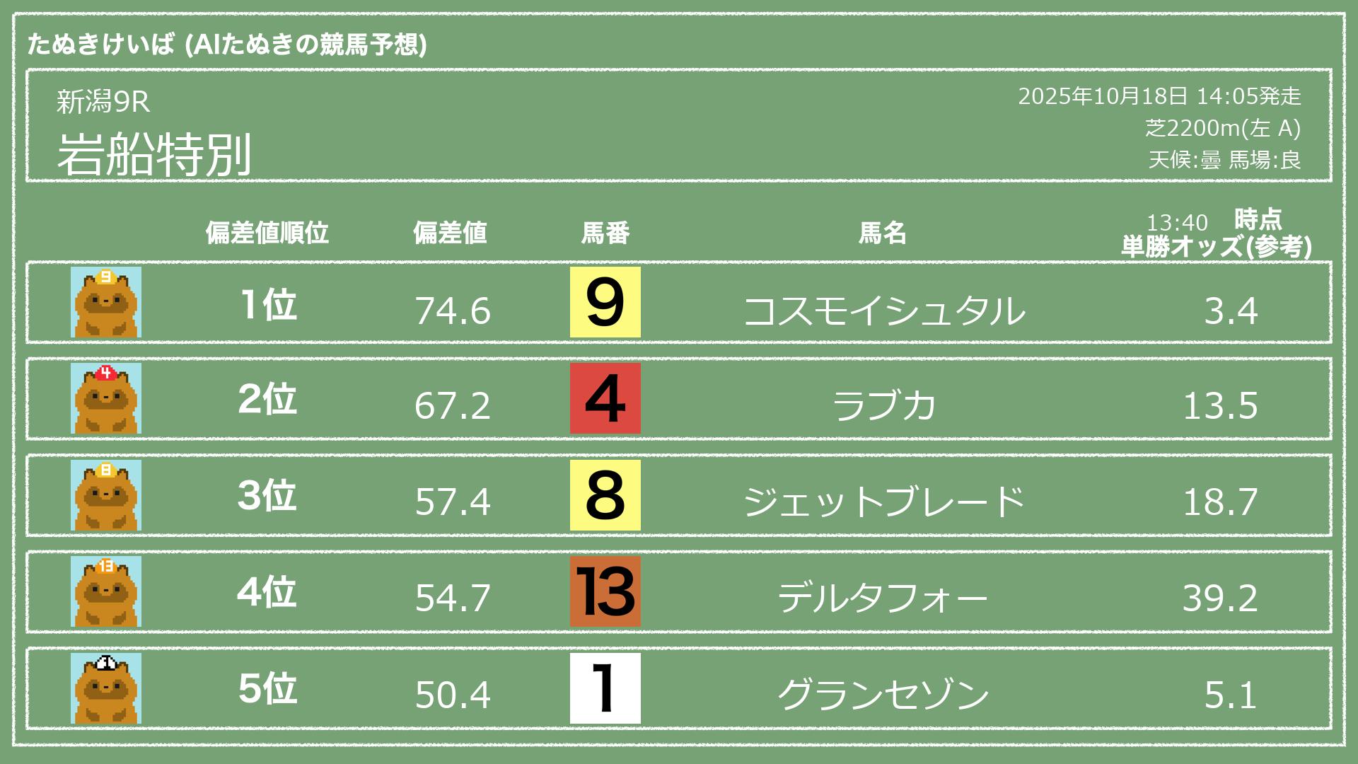 うちのたぬき(AI)による競馬予想です。レースごとに各馬の能力を偏差値で表現してみました。