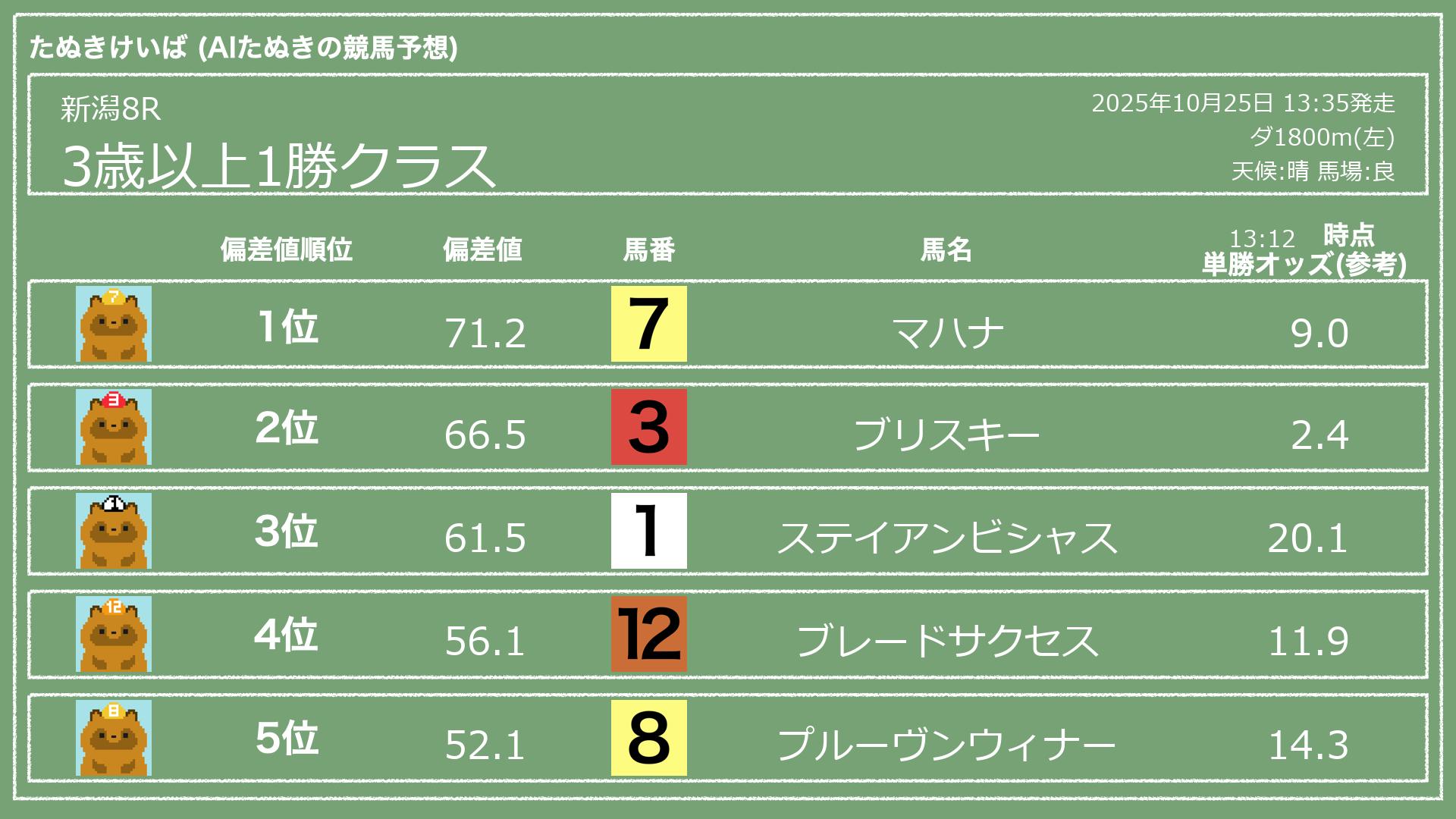 うちのたぬき(AI)による競馬予想です。レースごとに各馬の能力を偏差値で表現してみました。