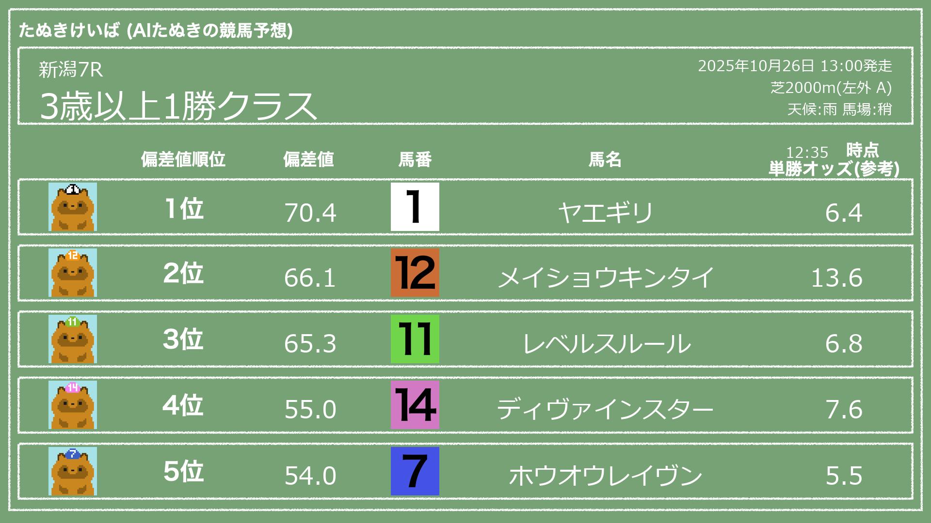 うちのたぬき(AI)による競馬予想です。レースごとに各馬の能力を偏差値で表現してみました。