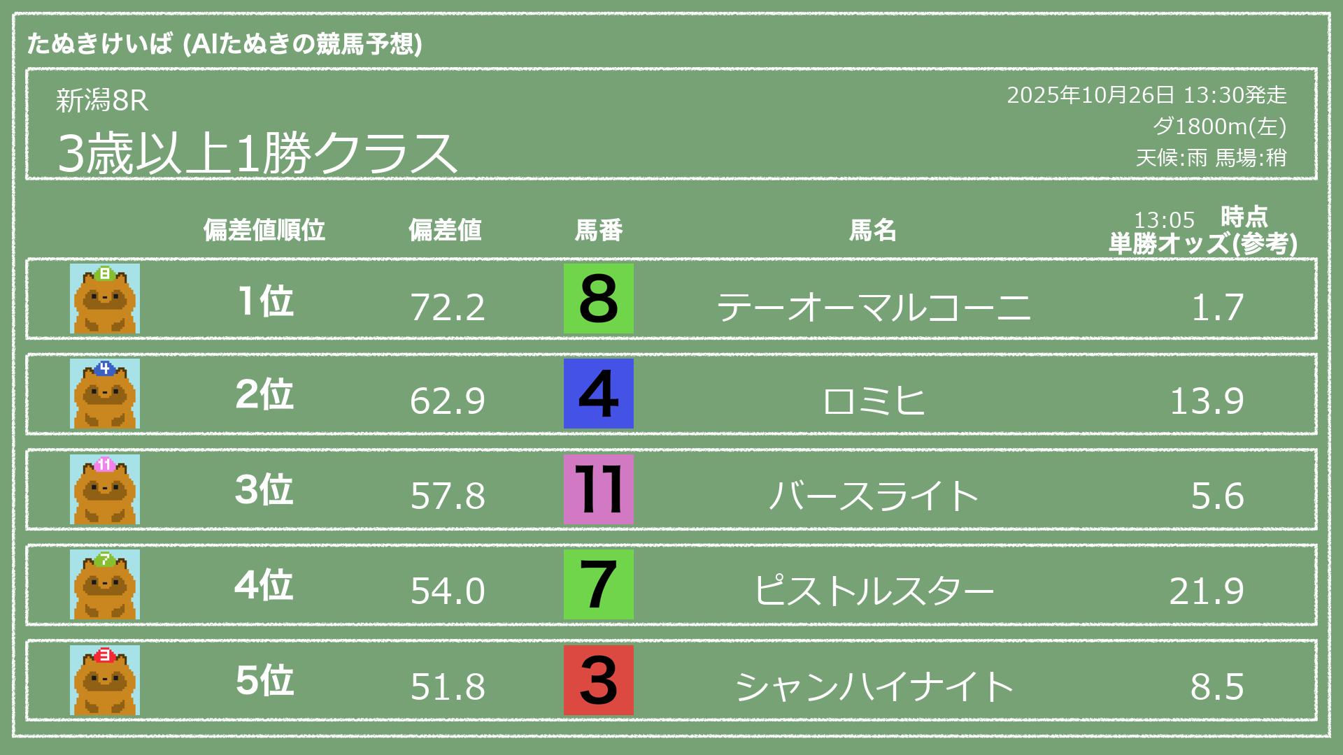 うちのたぬき(AI)による競馬予想です。レースごとに各馬の能力を偏差値で表現してみました。