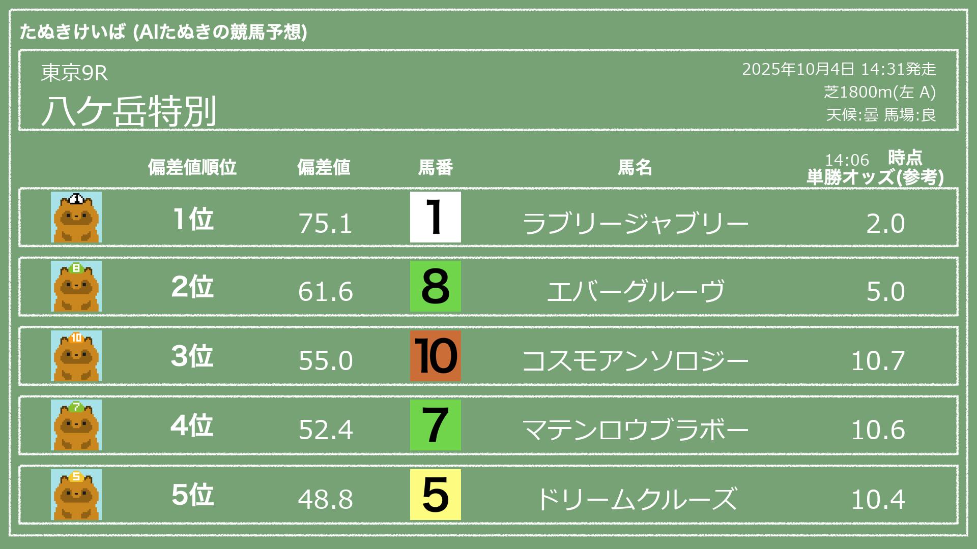 うちのたぬき(AI)による競馬予想です。レースごとに各馬の能力を偏差値で表現してみました。