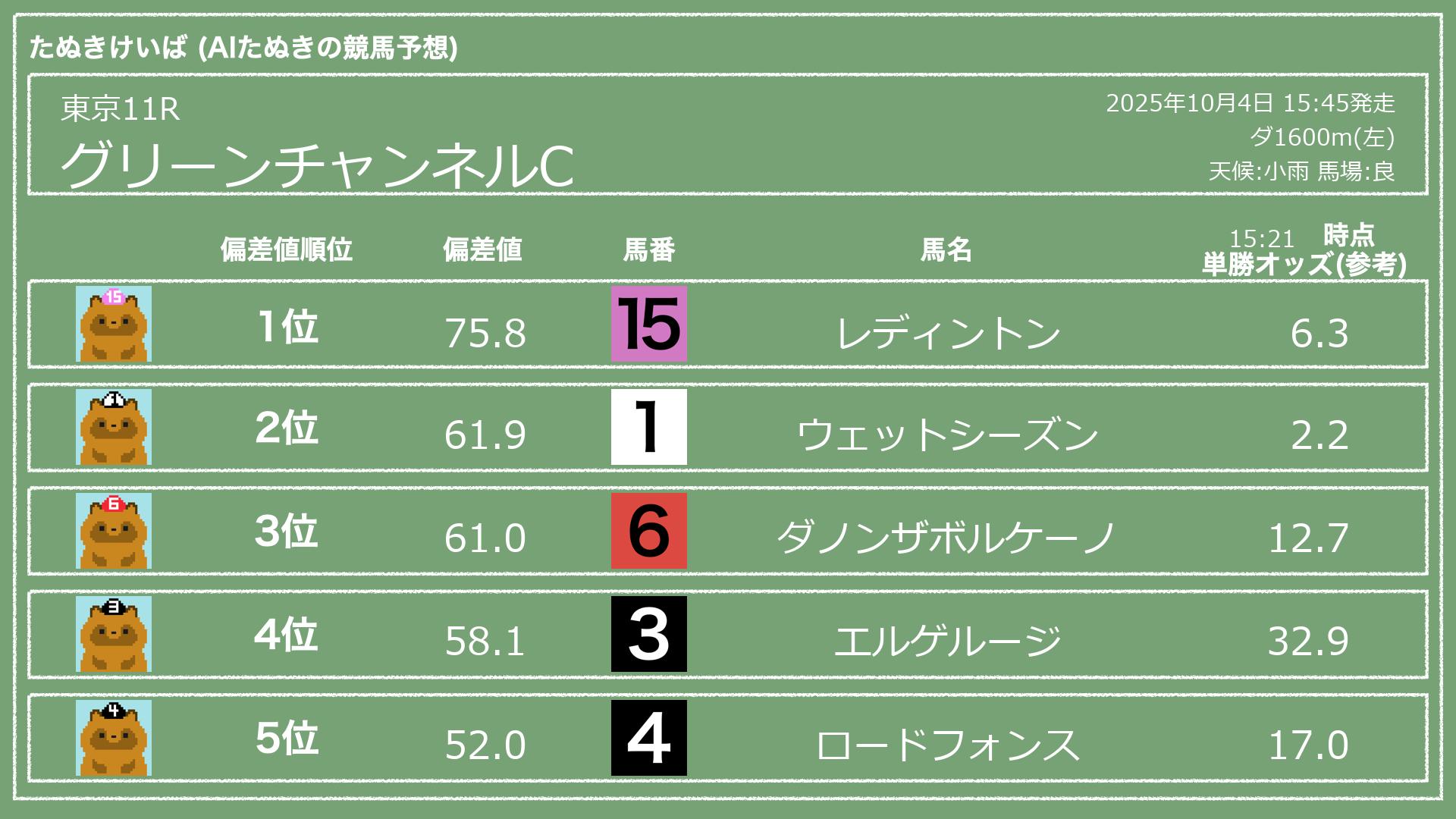 うちのたぬき(AI)による競馬予想です。レースごとに各馬の能力を偏差値で表現してみました。