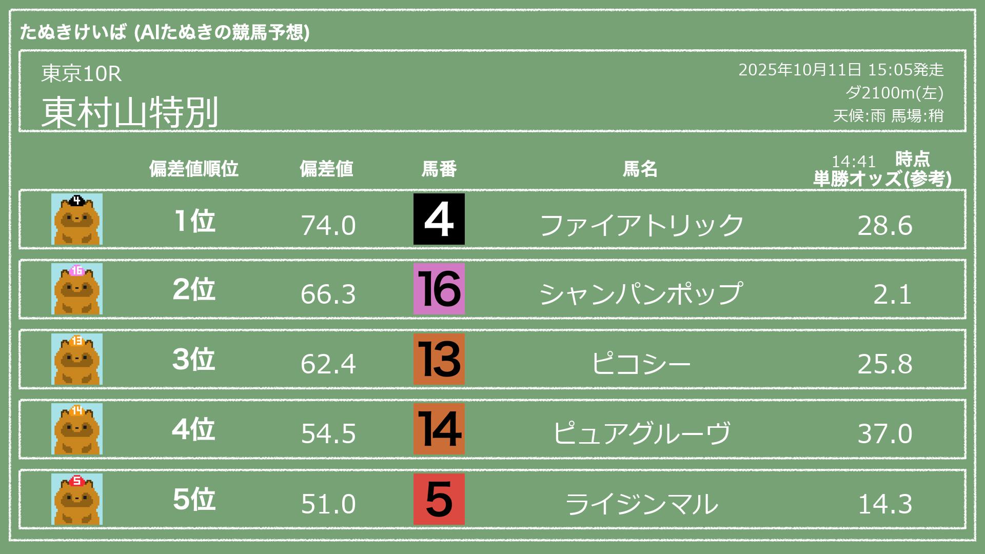 うちのたぬき(AI)による競馬予想です。レースごとに各馬の能力を偏差値で表現してみました。