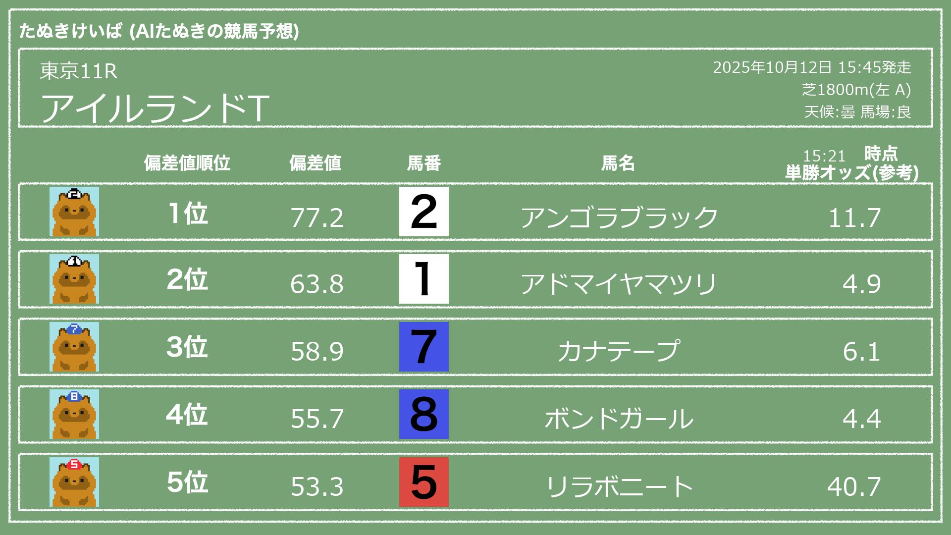 うちのたぬき(AI)による競馬予想です。レースごとに各馬の能力を偏差値で表現してみました。