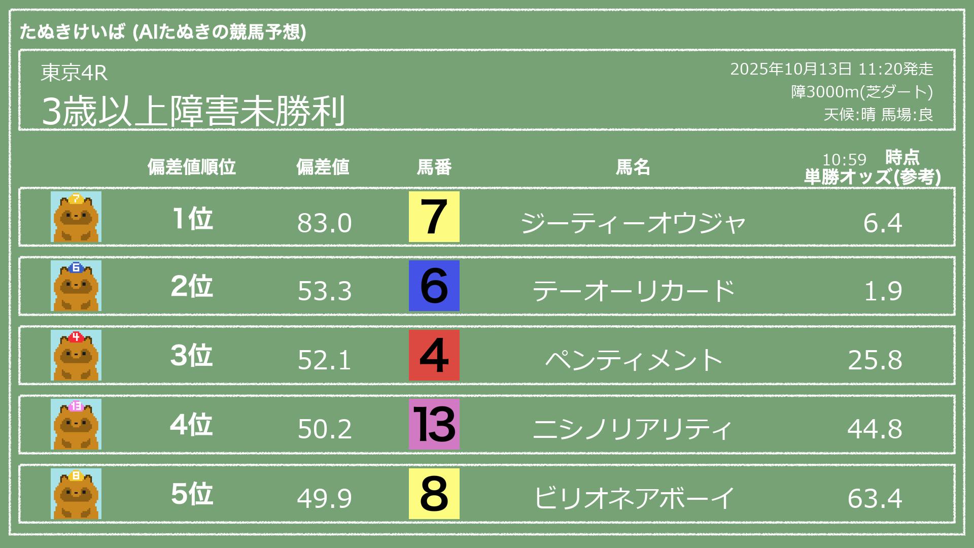 うちのたぬき(AI)による競馬予想です。レースごとに各馬の能力を偏差値で表現してみました。