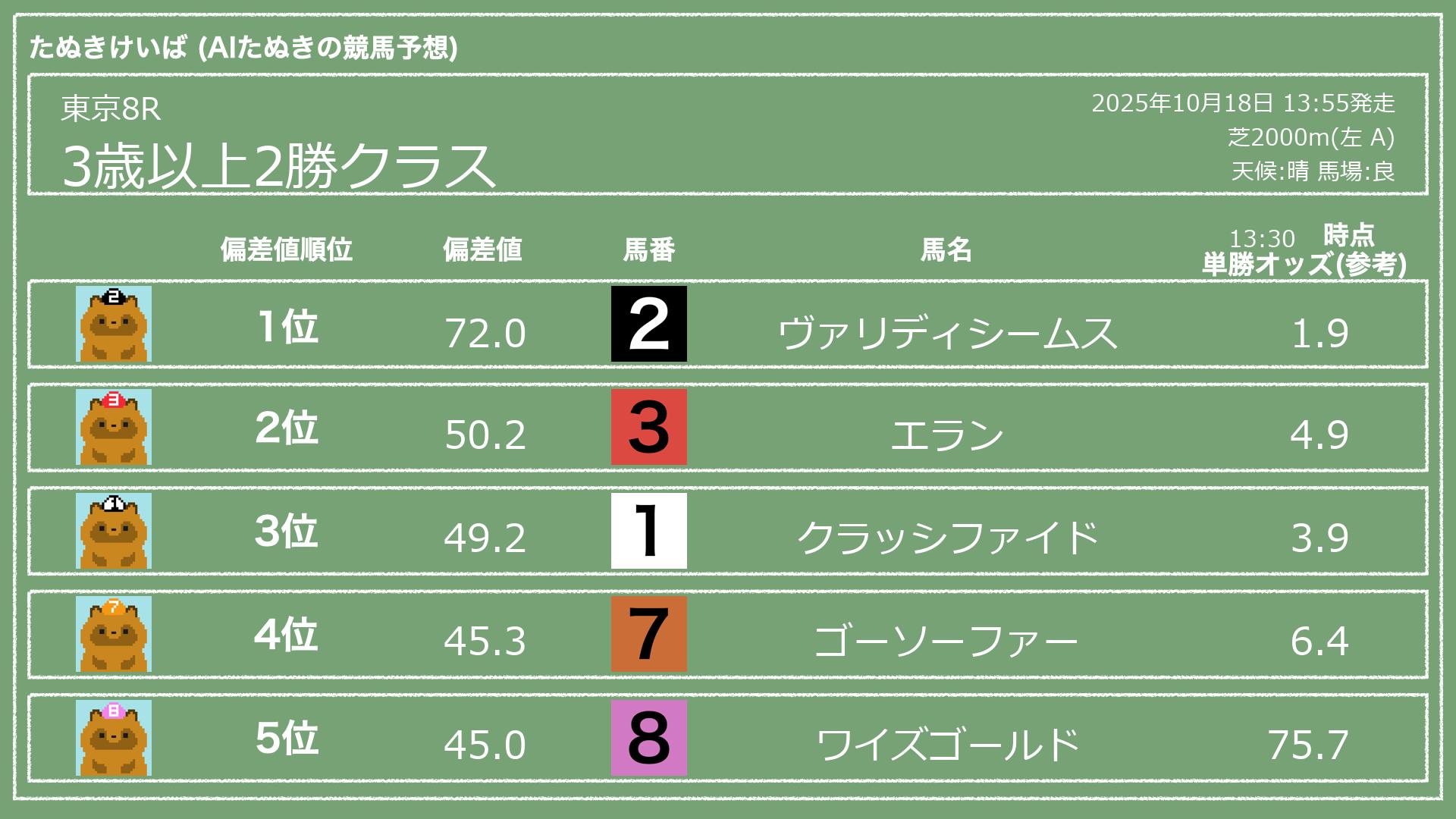 うちのたぬき(AI)による競馬予想です。レースごとに各馬の能力を偏差値で表現してみました。