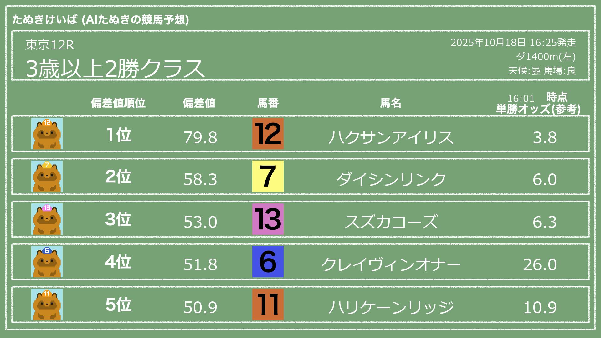 2025.10.18 東京12Rの予想