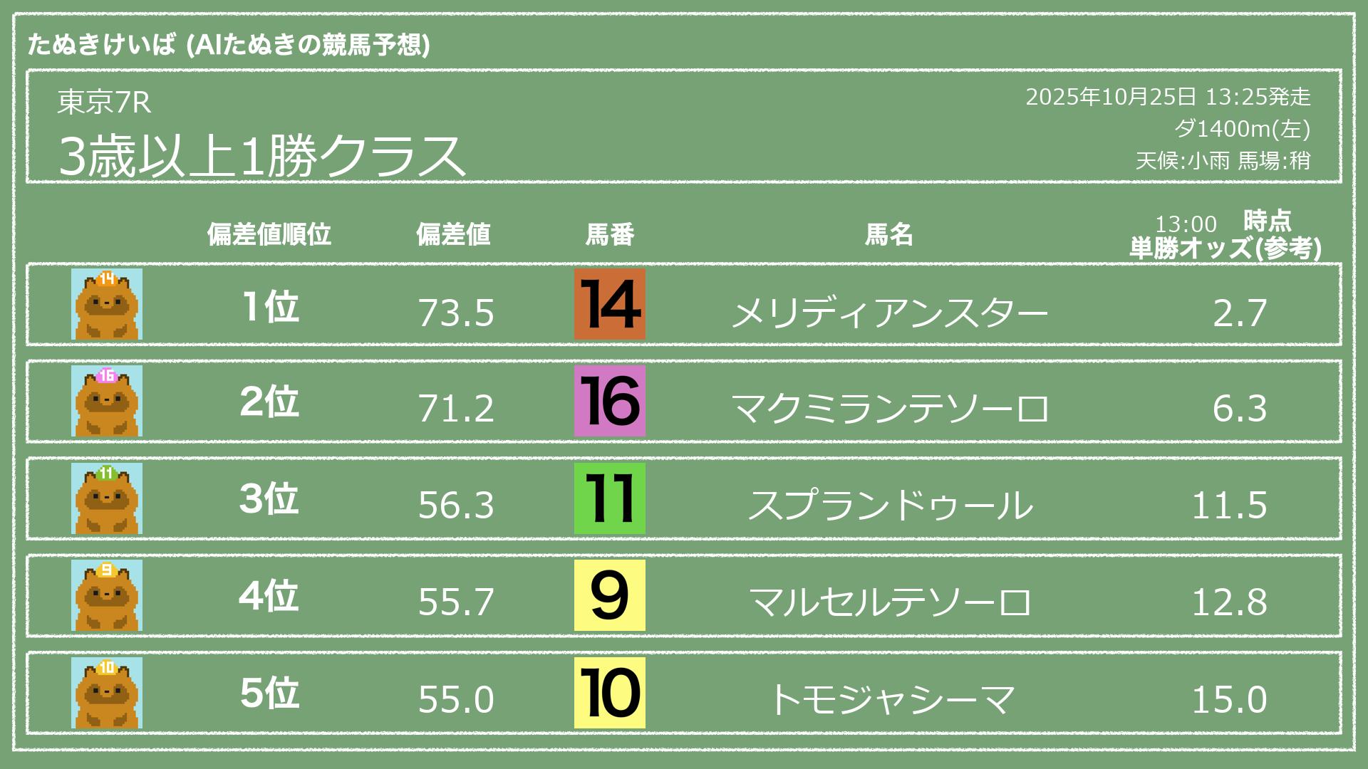うちのたぬき(AI)による競馬予想です。レースごとに各馬の能力を偏差値で表現してみました。