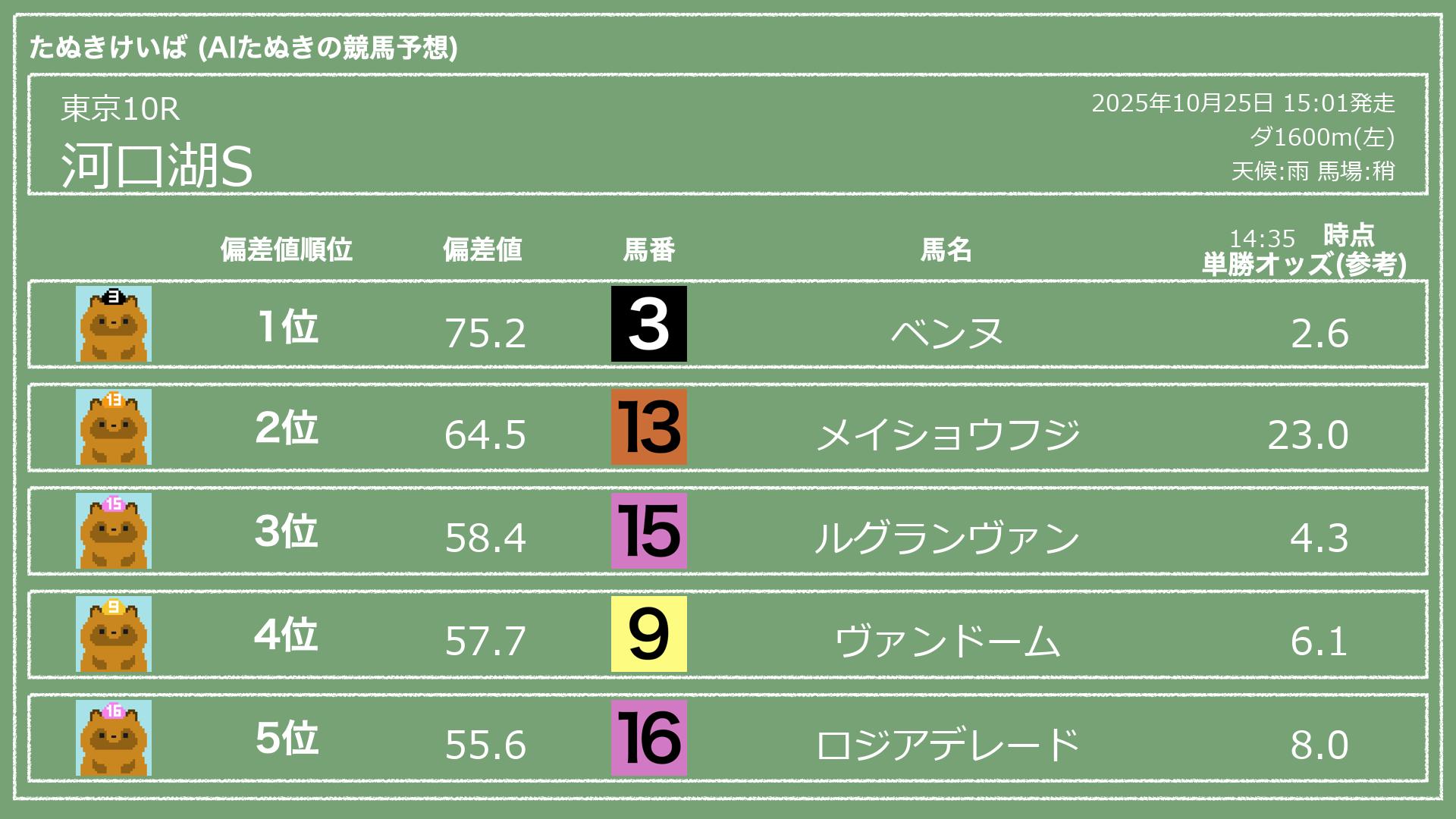 うちのたぬき(AI)による競馬予想です。レースごとに各馬の能力を偏差値で表現してみました。