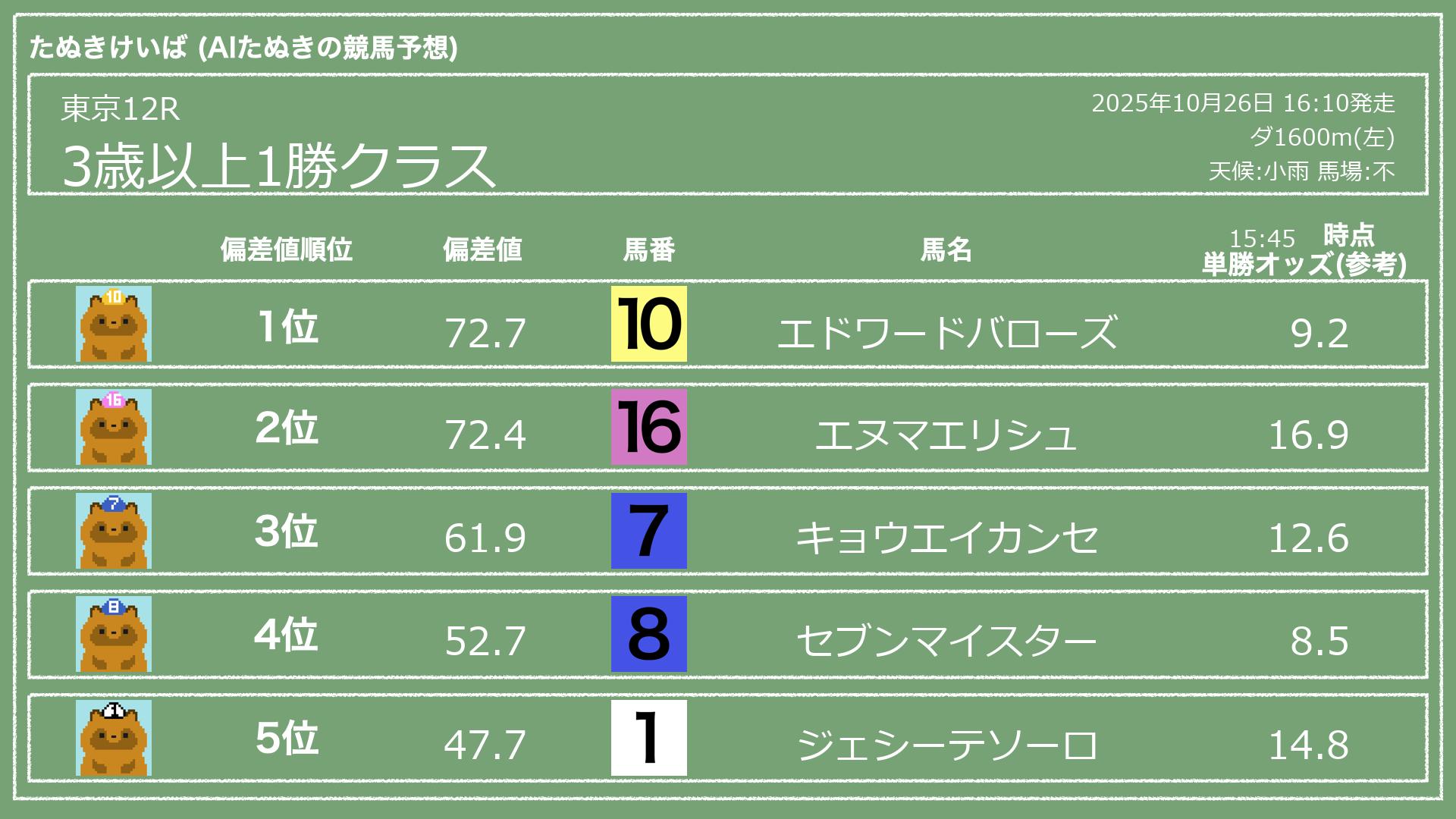 うちのたぬき(AI)による競馬予想です。レースごとに各馬の能力を偏差値で表現してみました。