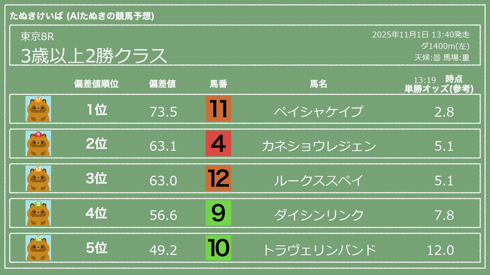 うちのたぬき(AI)による競馬予想です。レースごとに各馬の能力を偏差値で表現してみました。