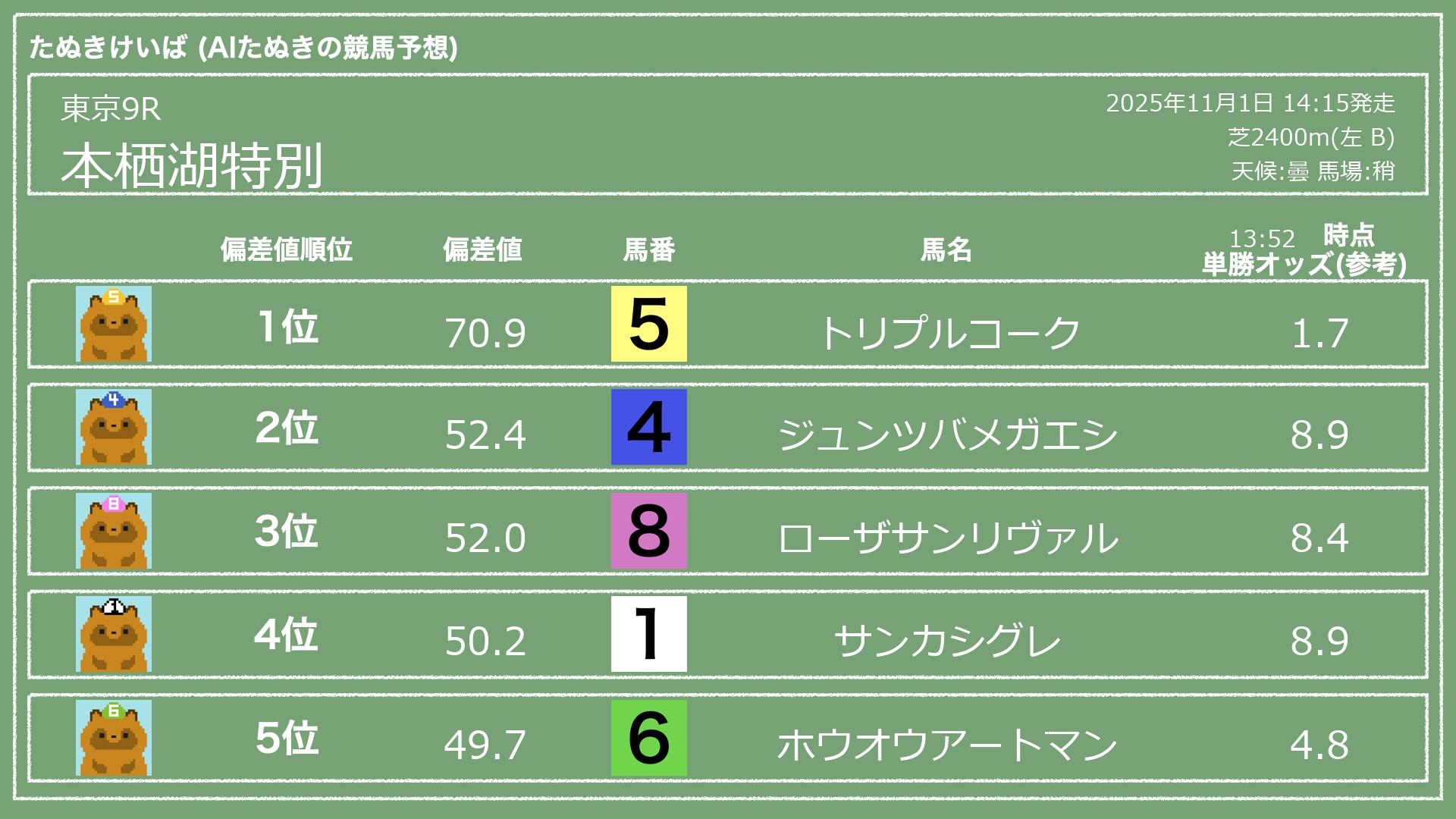 うちのたぬき(AI)による競馬予想です。レースごとに各馬の能力を偏差値で表現してみました。