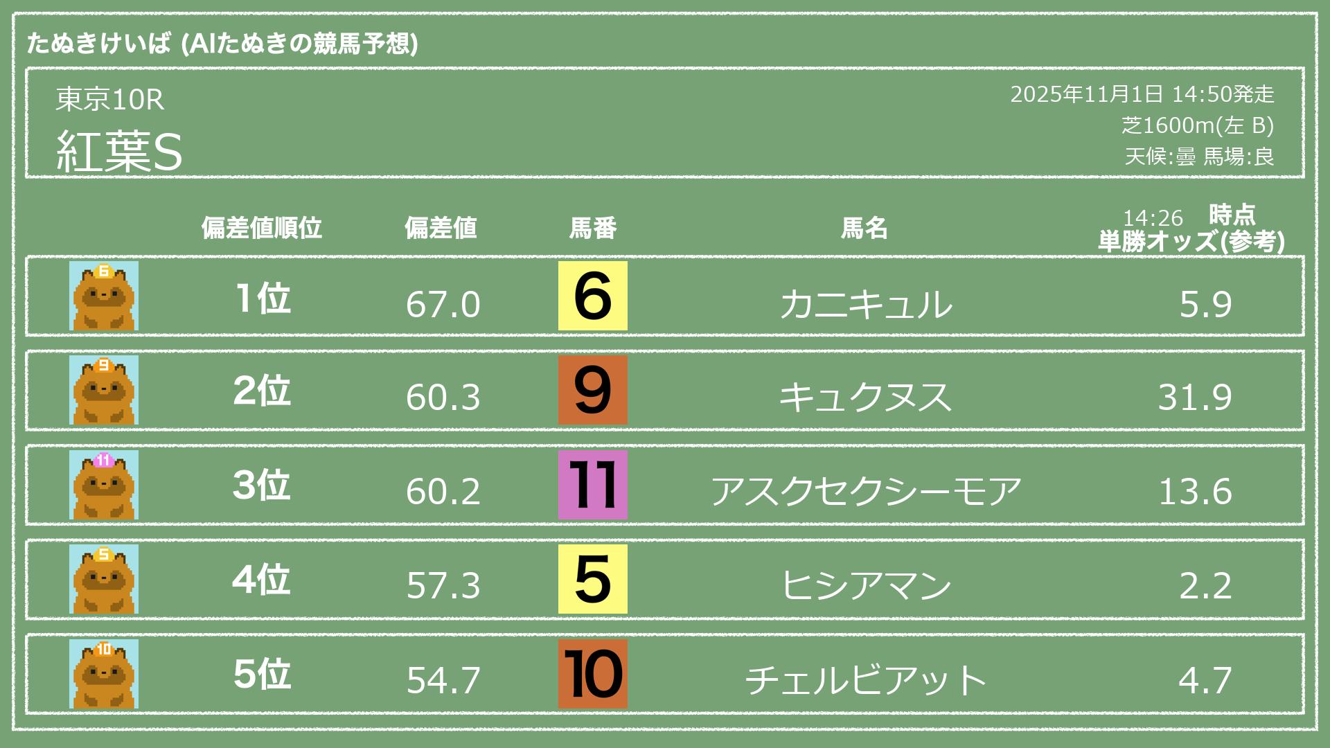 うちのたぬき(AI)による競馬予想です。レースごとに各馬の能力を偏差値で表現してみました。