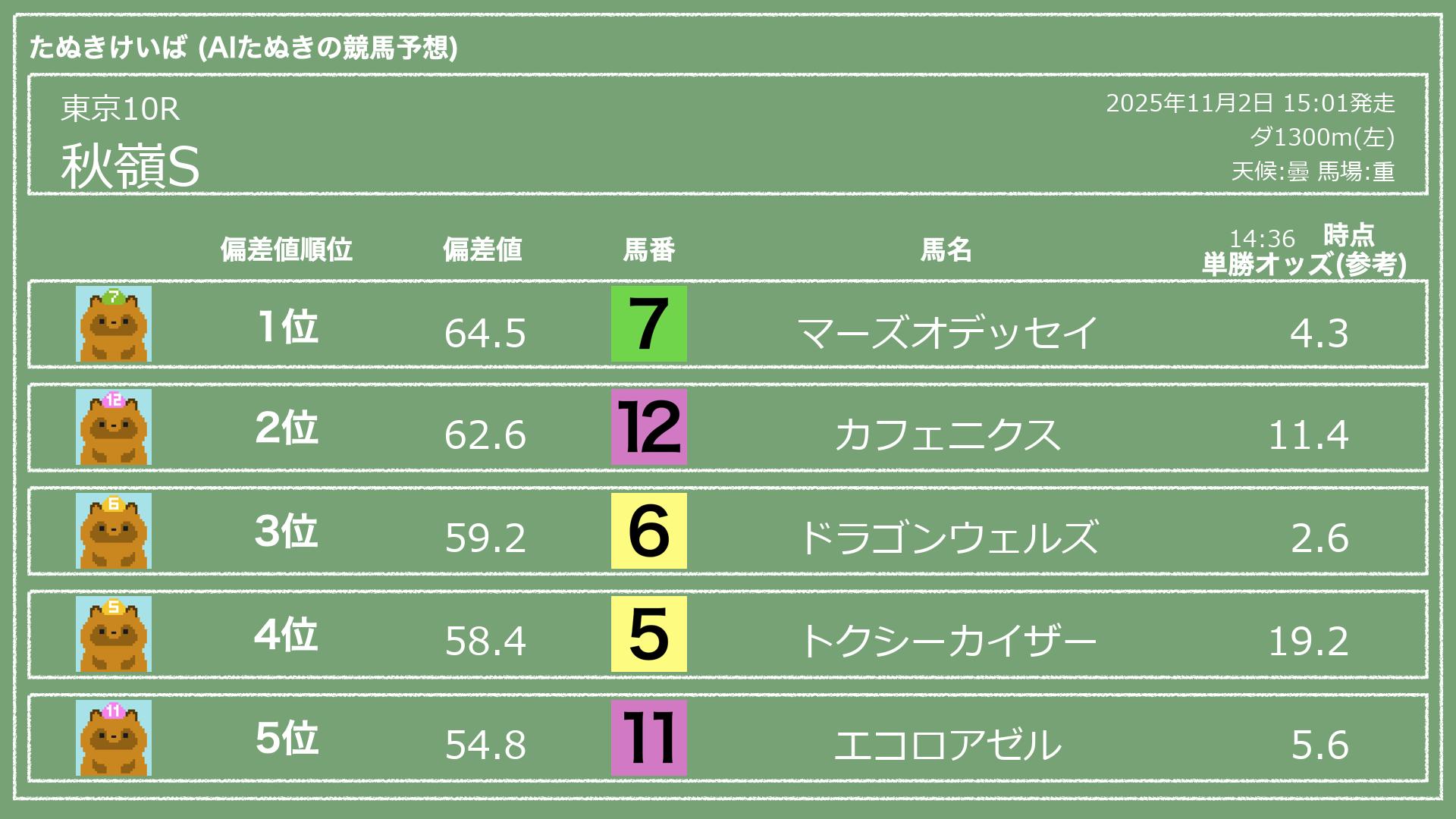 うちのたぬき(AI)による競馬予想です。レースごとに各馬の能力を偏差値で表現してみました。