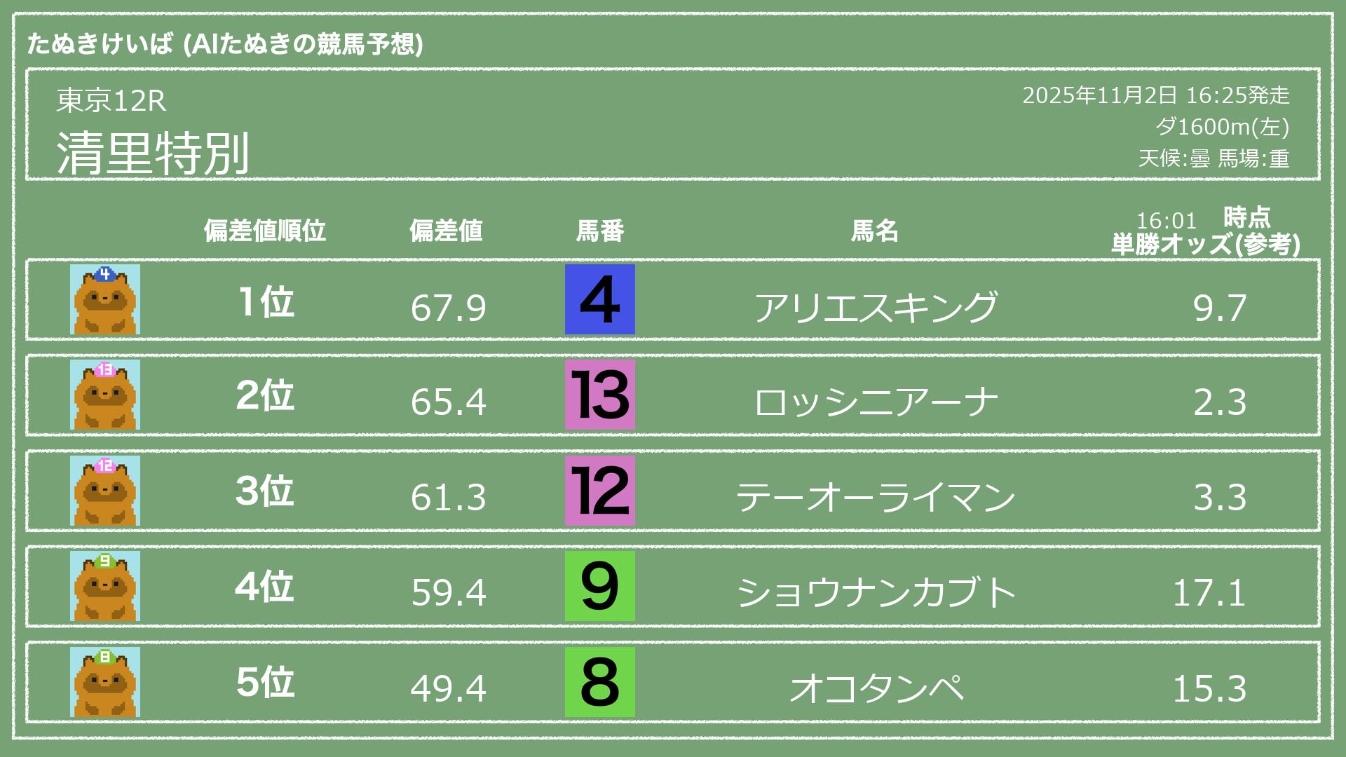 うちのたぬき(AI)による競馬予想です。レースごとに各馬の能力を偏差値で表現してみました。
