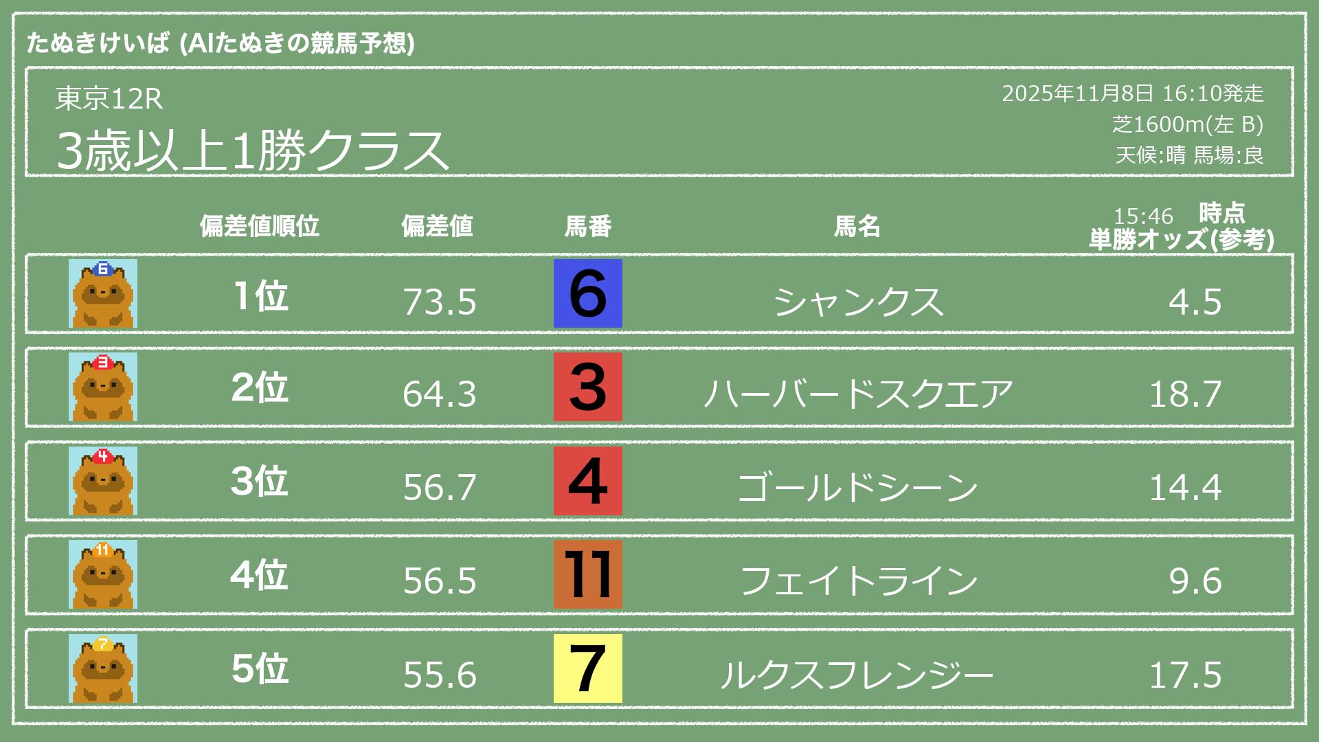 うちのたぬき(AI)による競馬予想です。レースごとに各馬の能力を偏差値で表現してみました。