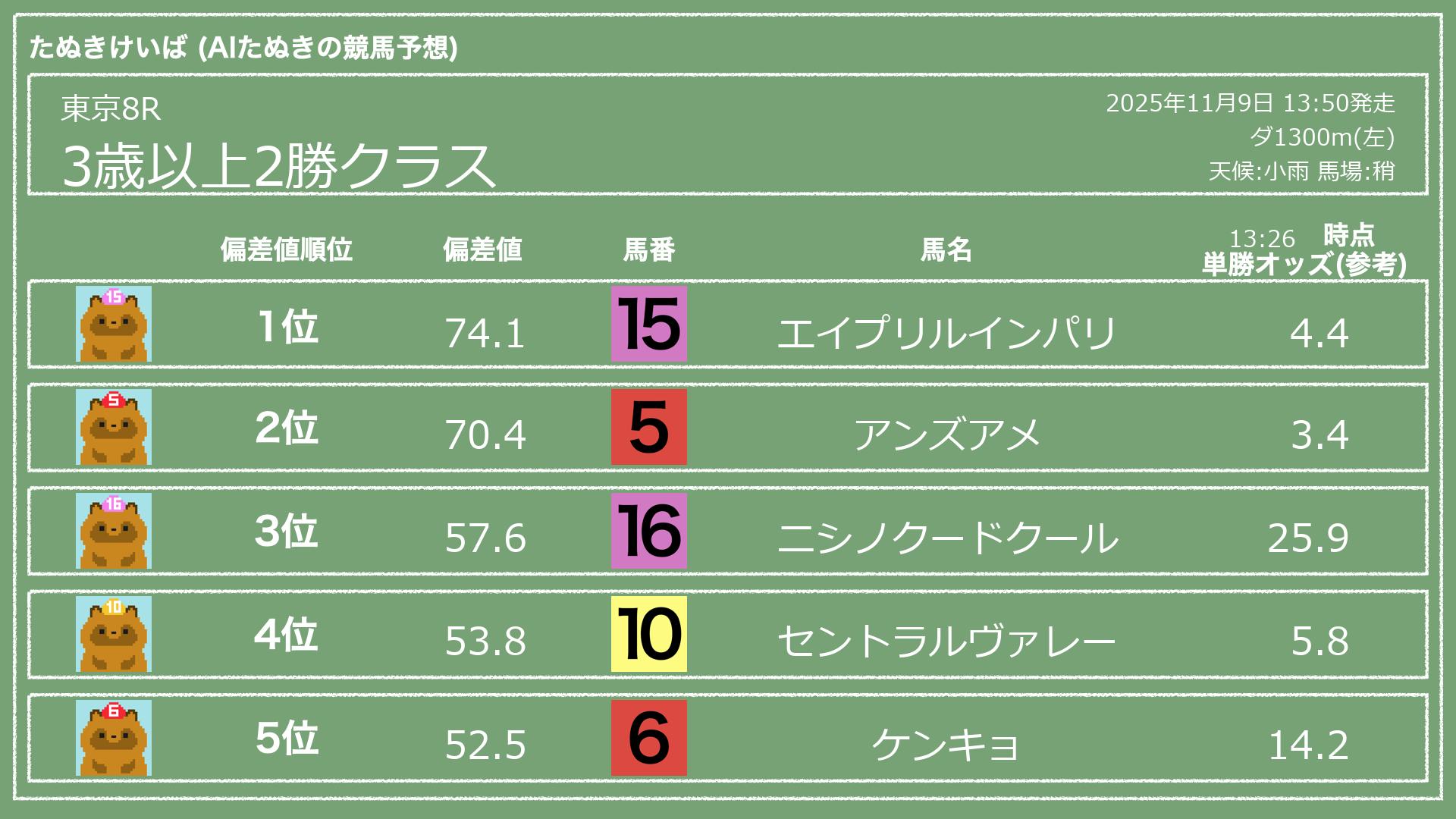 うちのたぬき(AI)による競馬予想です。レースごとに各馬の能力を偏差値で表現してみました。
