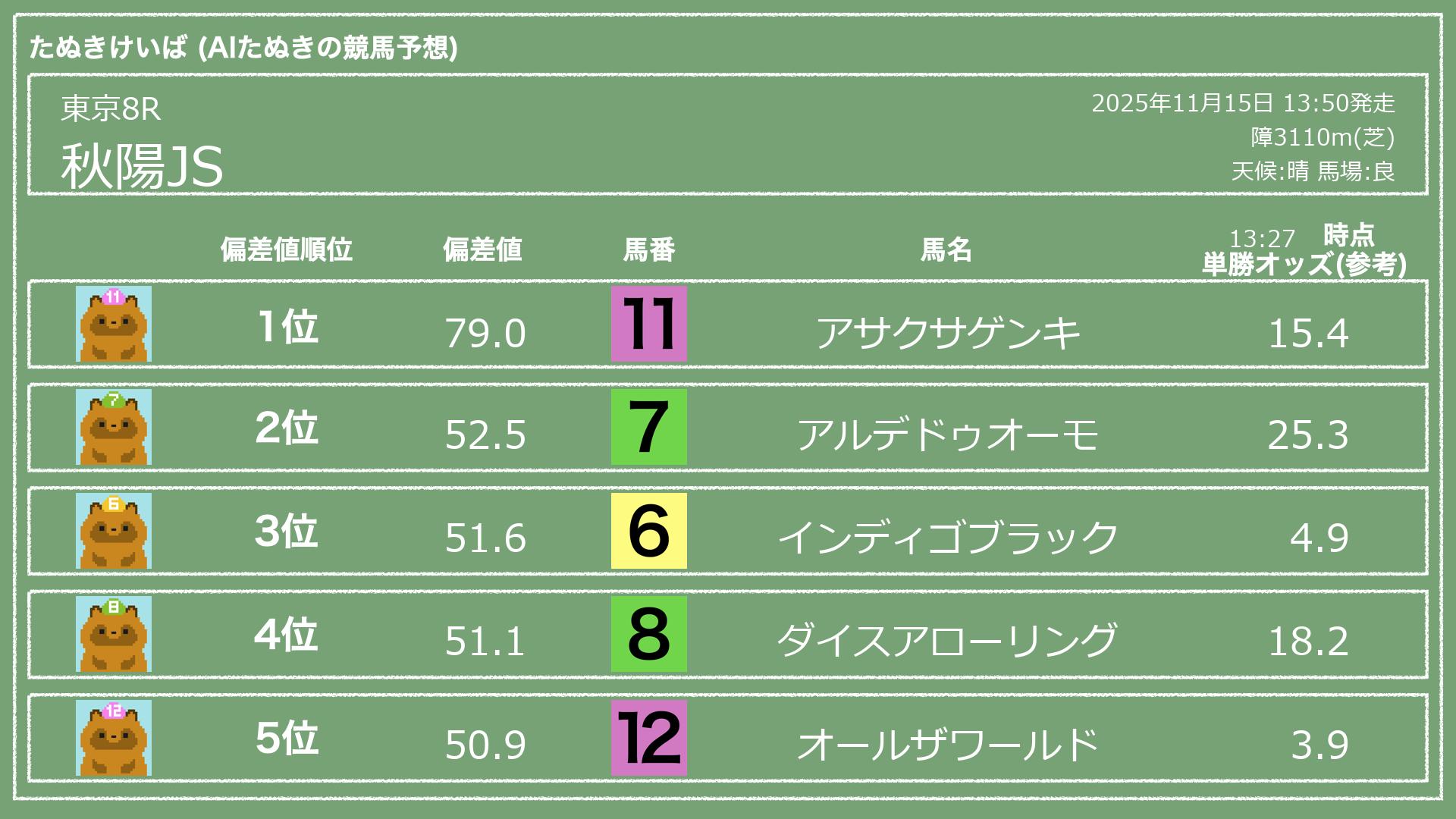 うちのたぬき(AI)による競馬予想です。レースごとに各馬の能力を偏差値で表現してみました。
