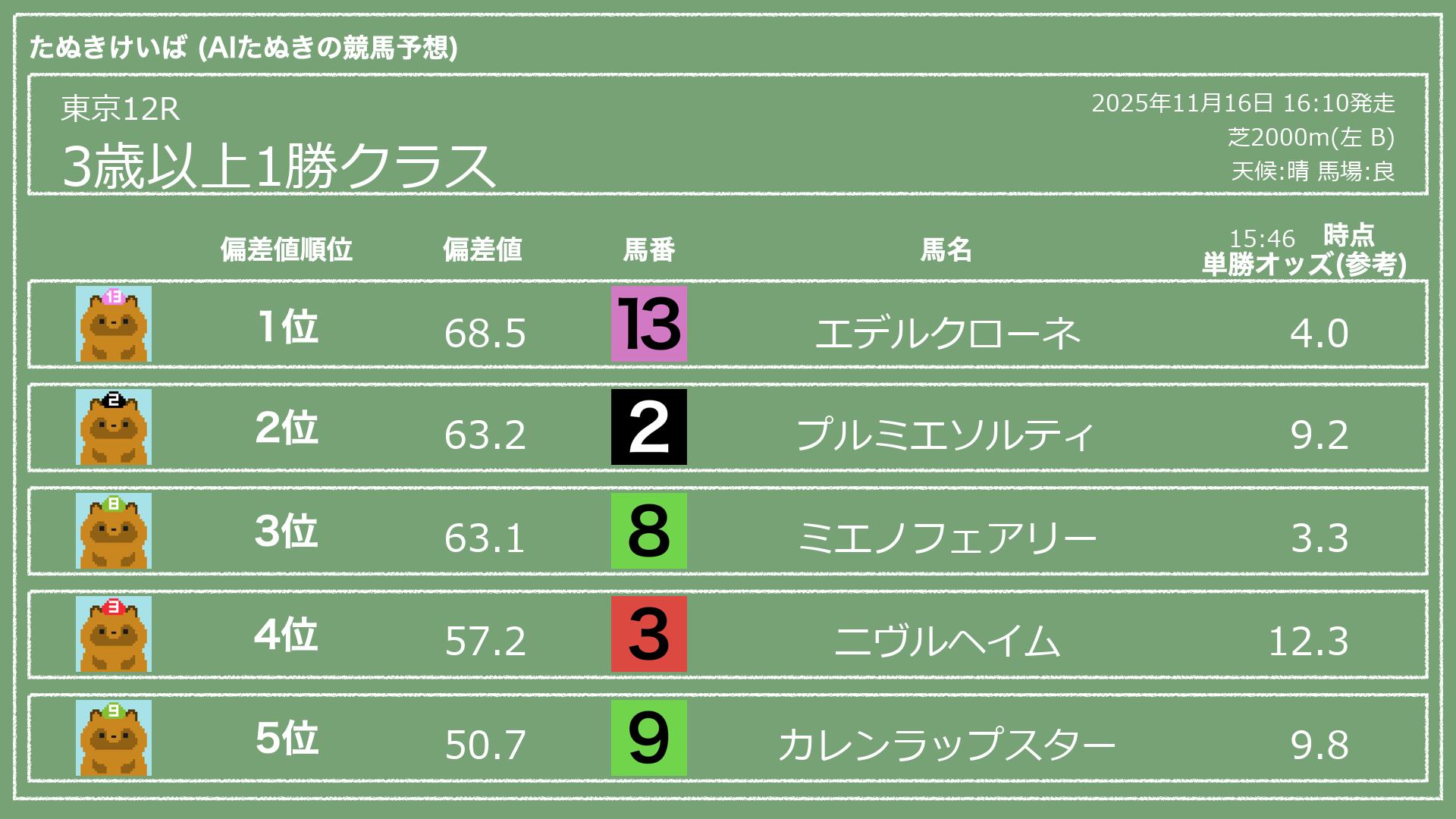 うちのたぬき(AI)による競馬予想です。レースごとに各馬の能力を偏差値で表現してみました。