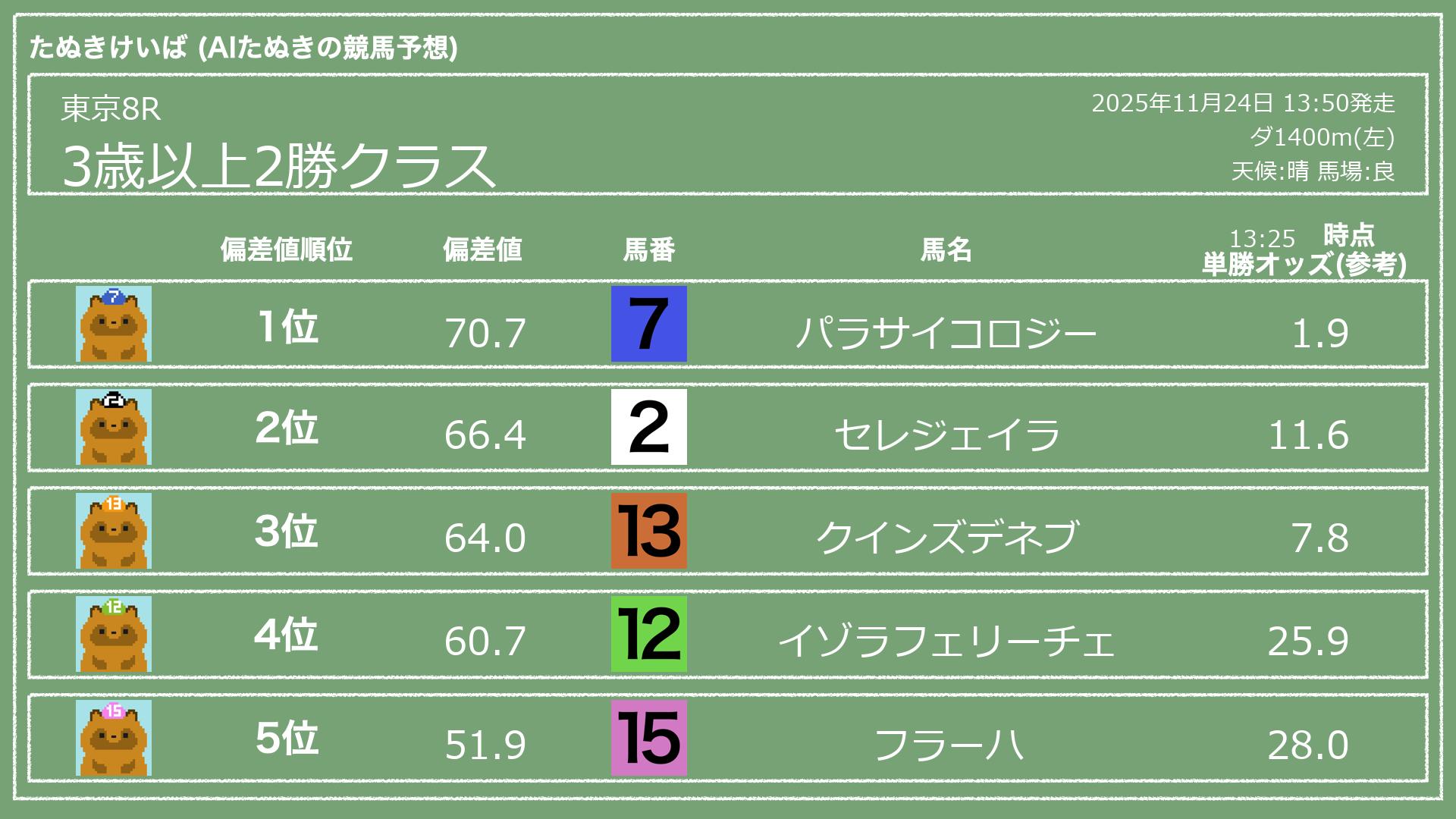 うちのたぬき(AI)による競馬予想です。レースごとに各馬の能力を偏差値で表現してみました。