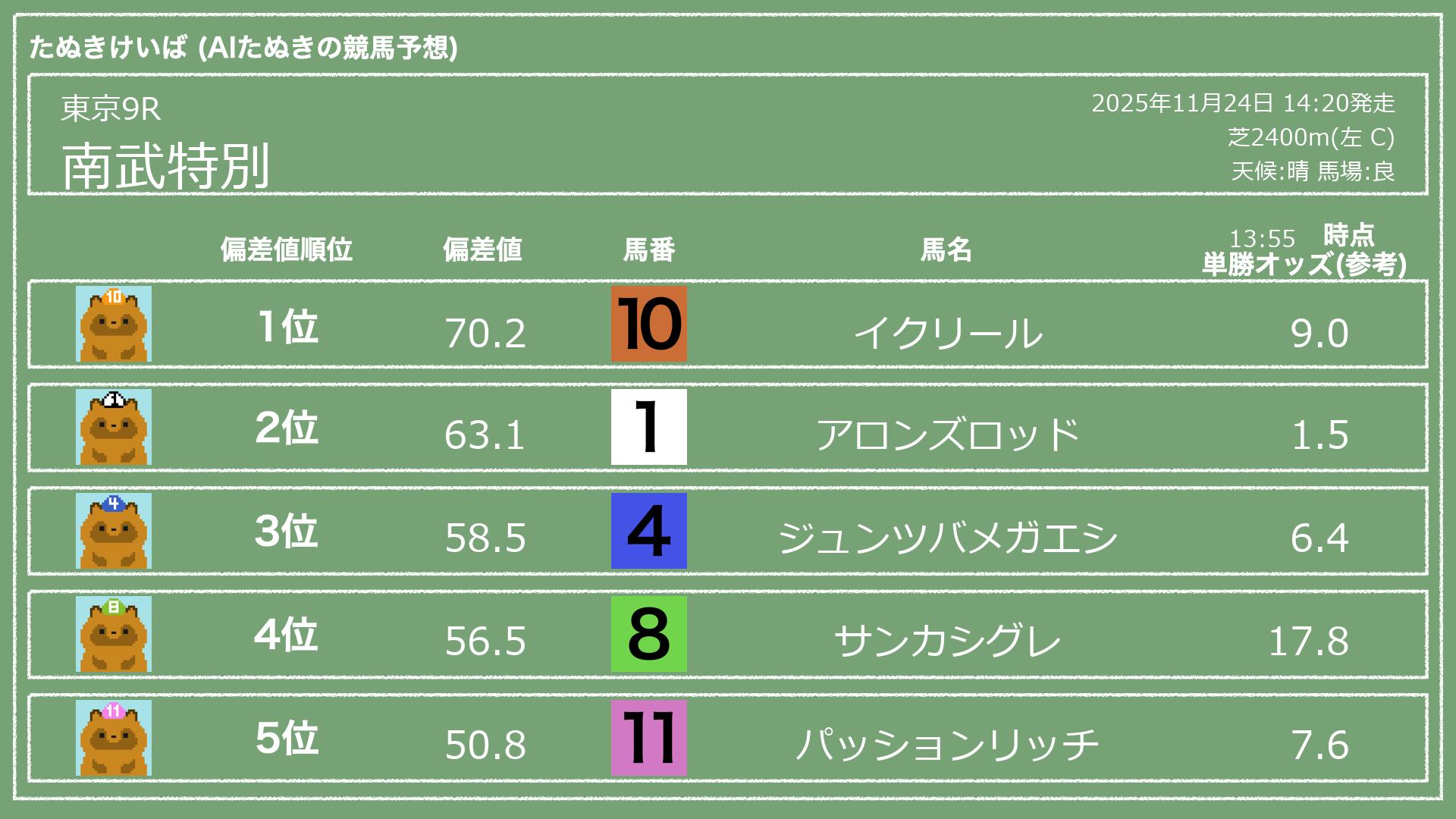 うちのたぬき(AI)による競馬予想です。レースごとに各馬の能力を偏差値で表現してみました。