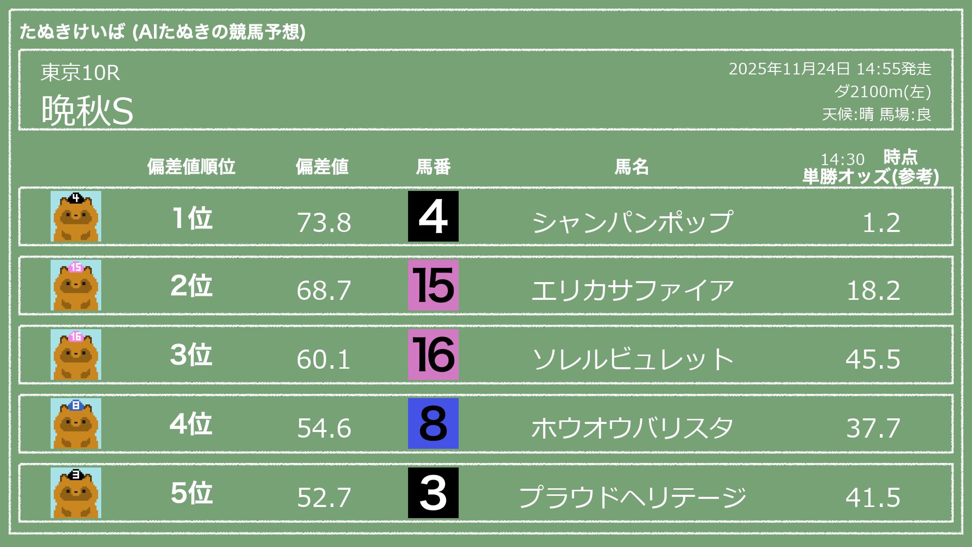 うちのたぬき(AI)による競馬予想です。レースごとに各馬の能力を偏差値で表現してみました。