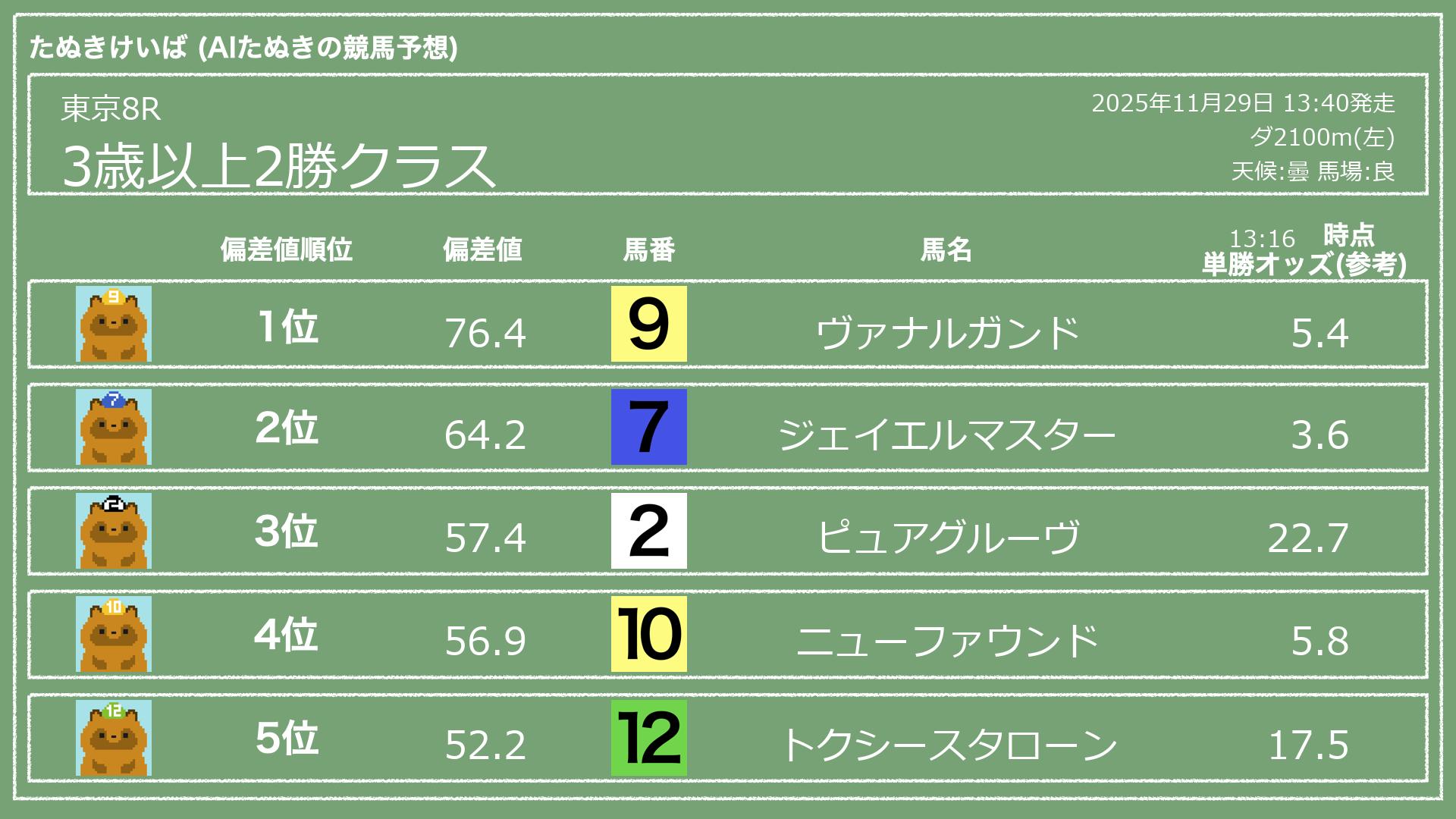 うちのたぬき(AI)による競馬予想です。レースごとに各馬の能力を偏差値で表現してみました。