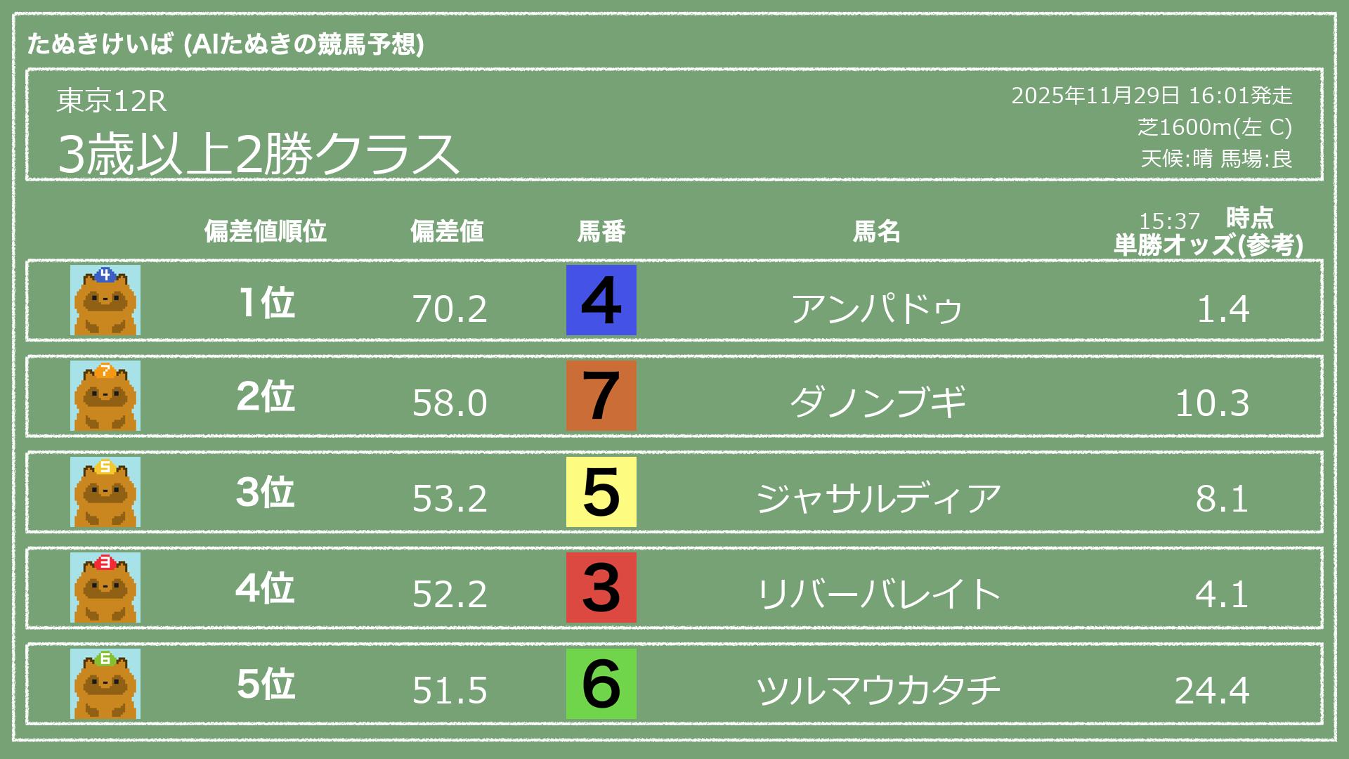 うちのたぬき(AI)による競馬予想です。レースごとに各馬の能力を偏差値で表現してみました。