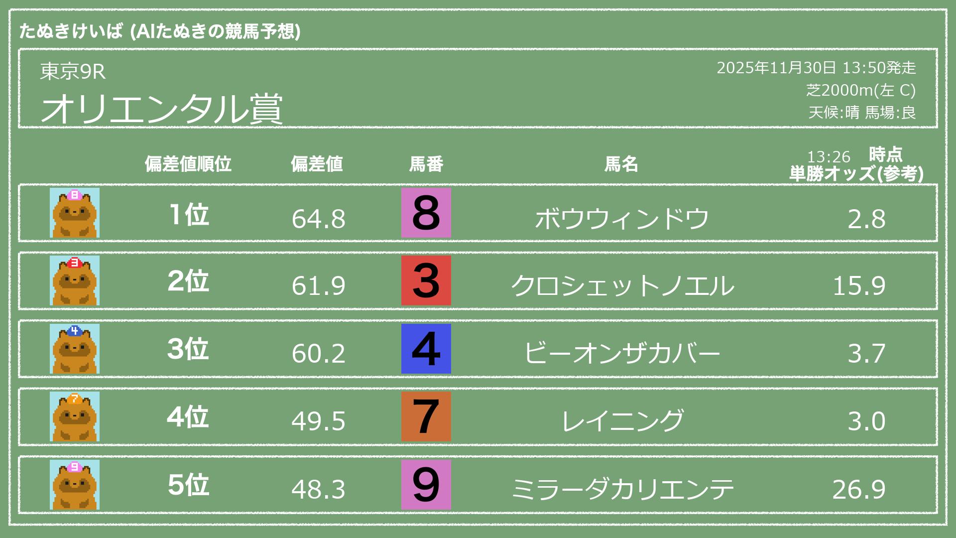 うちのたぬき(AI)による競馬予想です。レースごとに各馬の能力を偏差値で表現してみました。