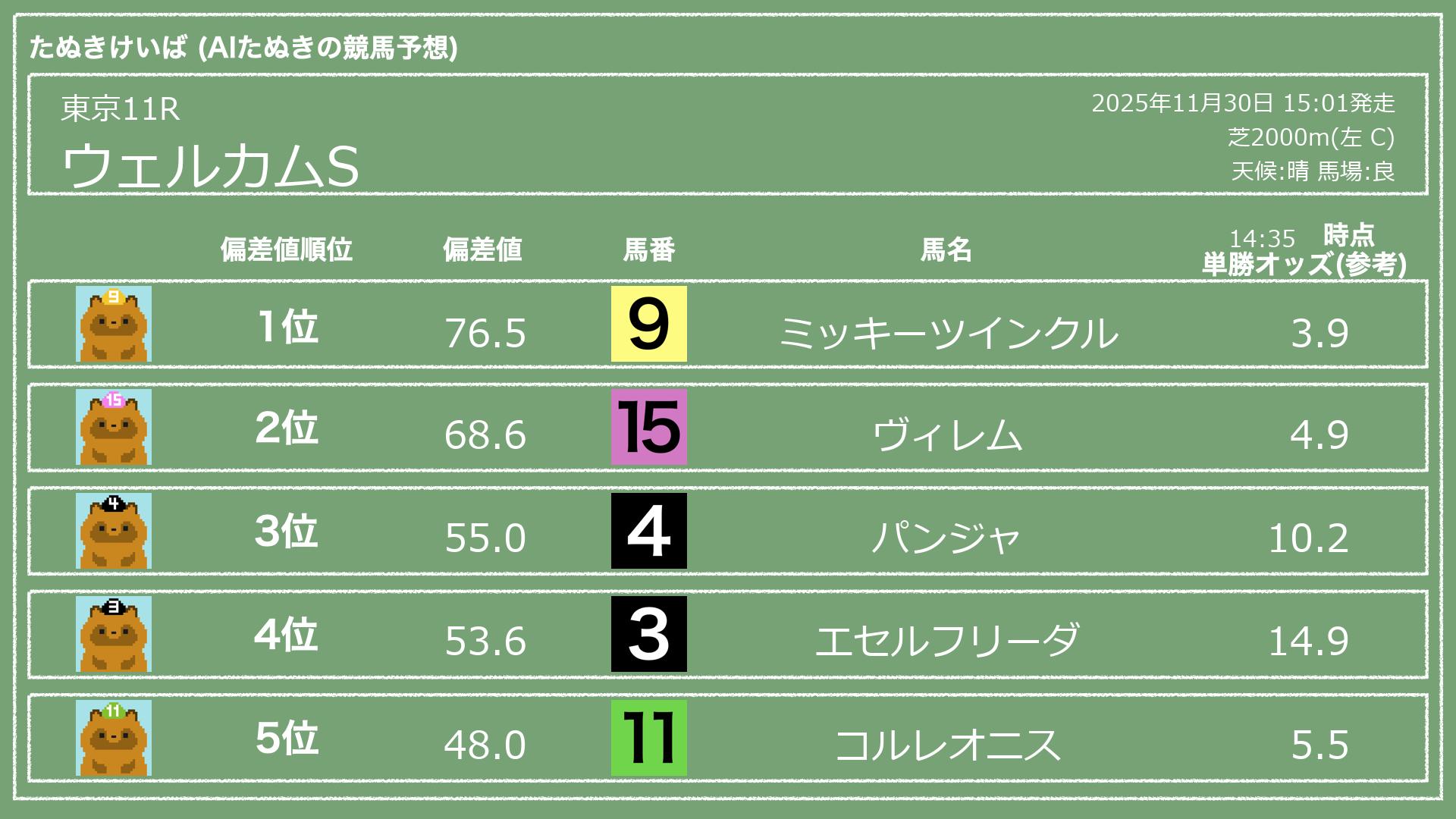 うちのたぬき(AI)による競馬予想です。レースごとに各馬の能力を偏差値で表現してみました。