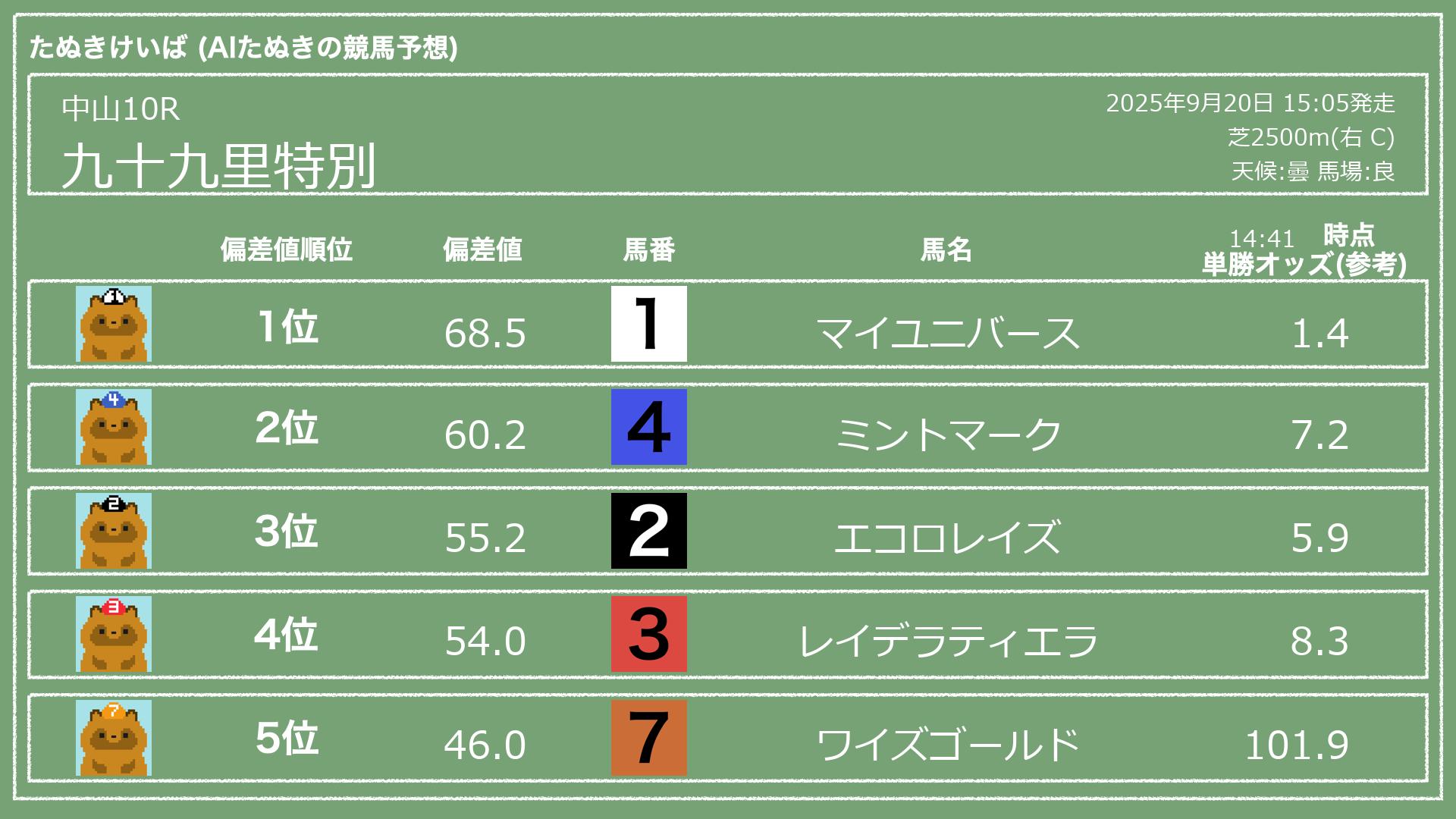 うちのたぬき(AI)による競馬予想です。