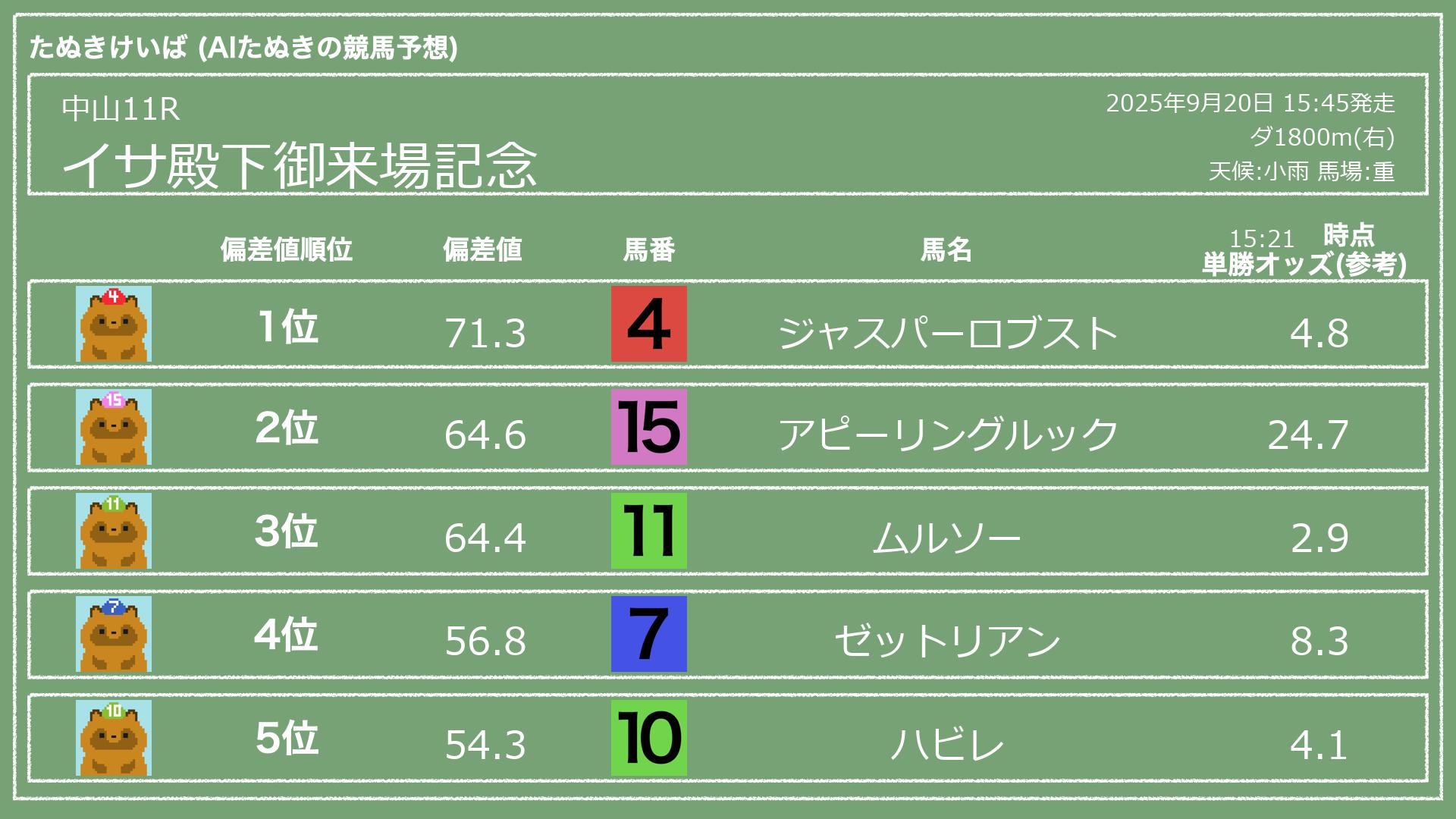 うちのたぬき(AI)による競馬予想です。レースごとに各馬の能力を偏差値で表現してみました。