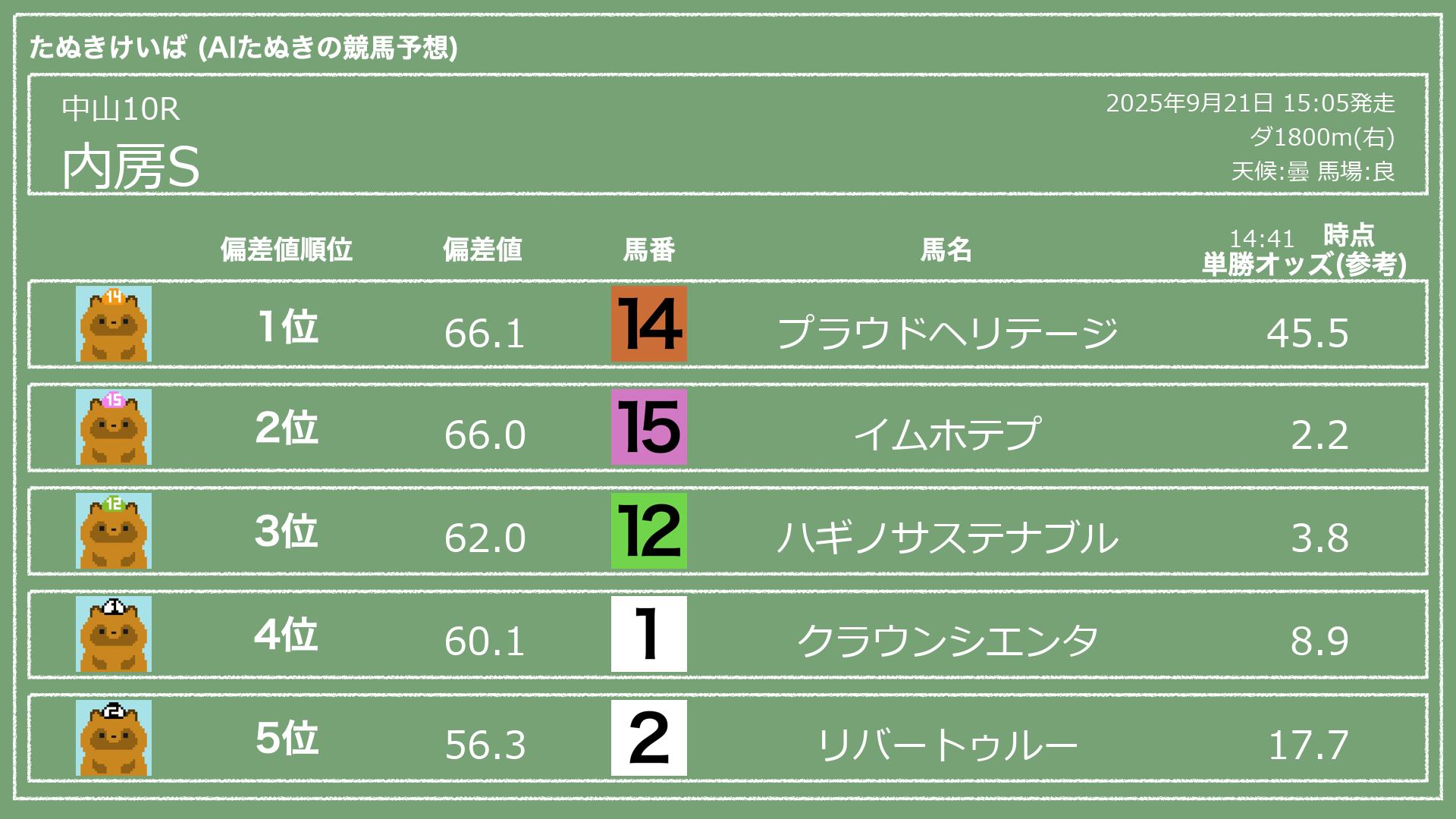 うちのたぬき(AI)による競馬予想です。