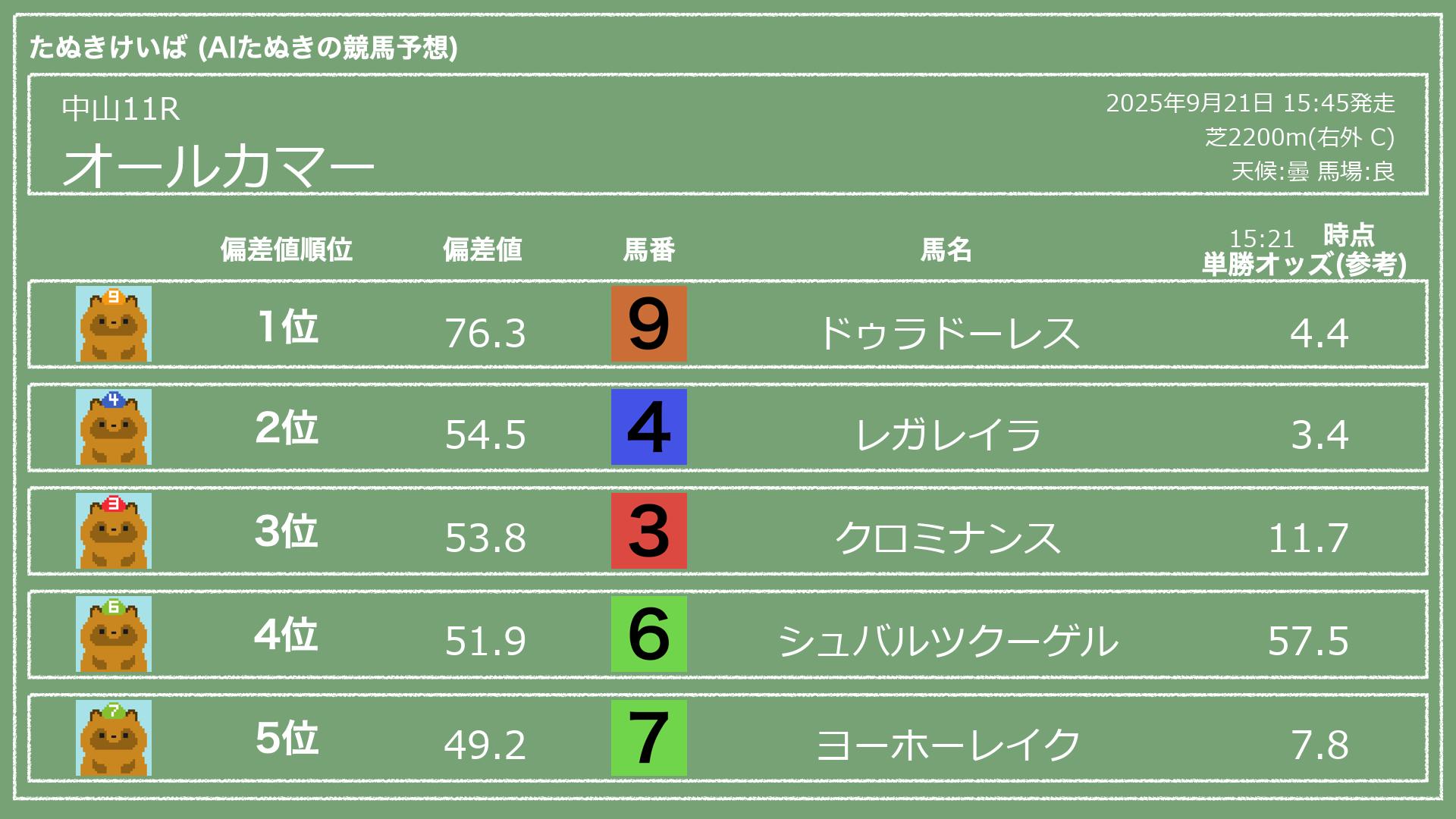 うちのたぬき(AI)による競馬予想です。レースごとに各馬の能力を偏差値で表現してみました。
