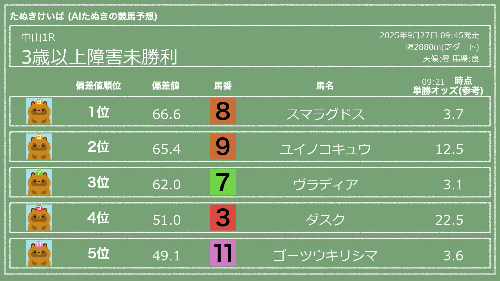 うちのたぬき(AI)による競馬予想です。レースごとに各馬の能力を偏差値で表現してみました。