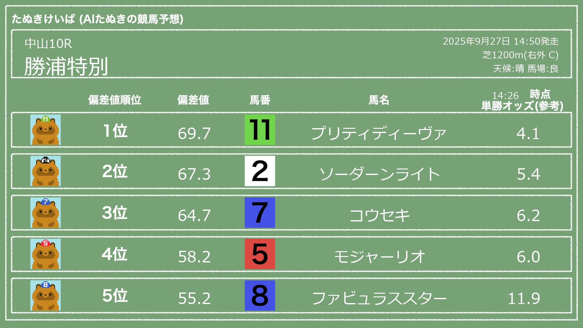 うちのたぬき(AI)による競馬予想です。レースごとに各馬の能力を偏差値で表現してみました。