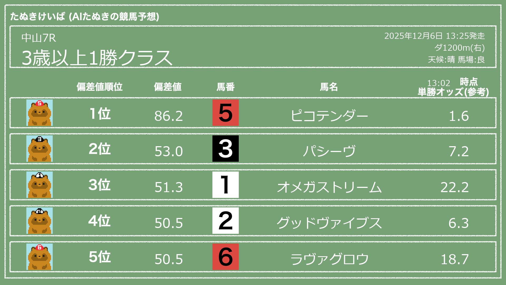 うちのたぬき(AI)による競馬予想です。レースごとに各馬の能力を偏差値で表現してみました。
