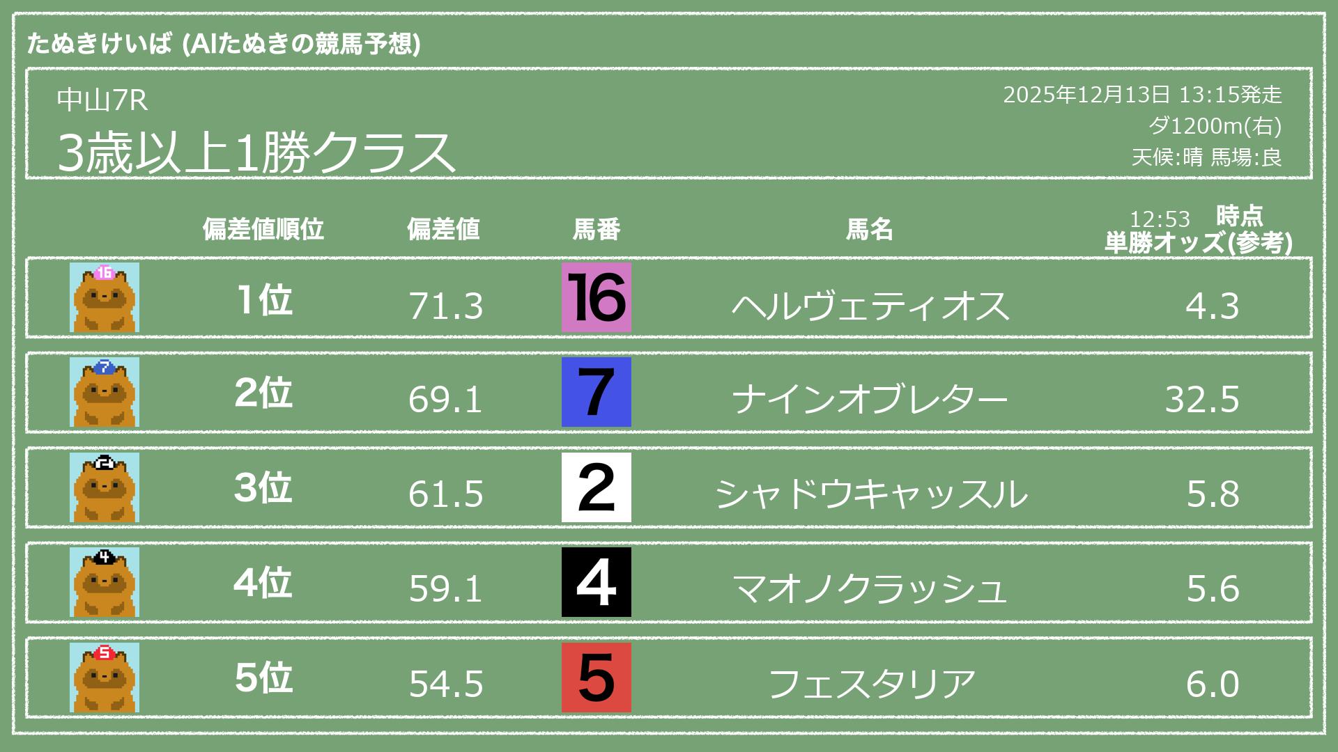 うちのたぬき(AI)による競馬予想です。レースごとに各馬の能力を偏差値で表現してみました。
