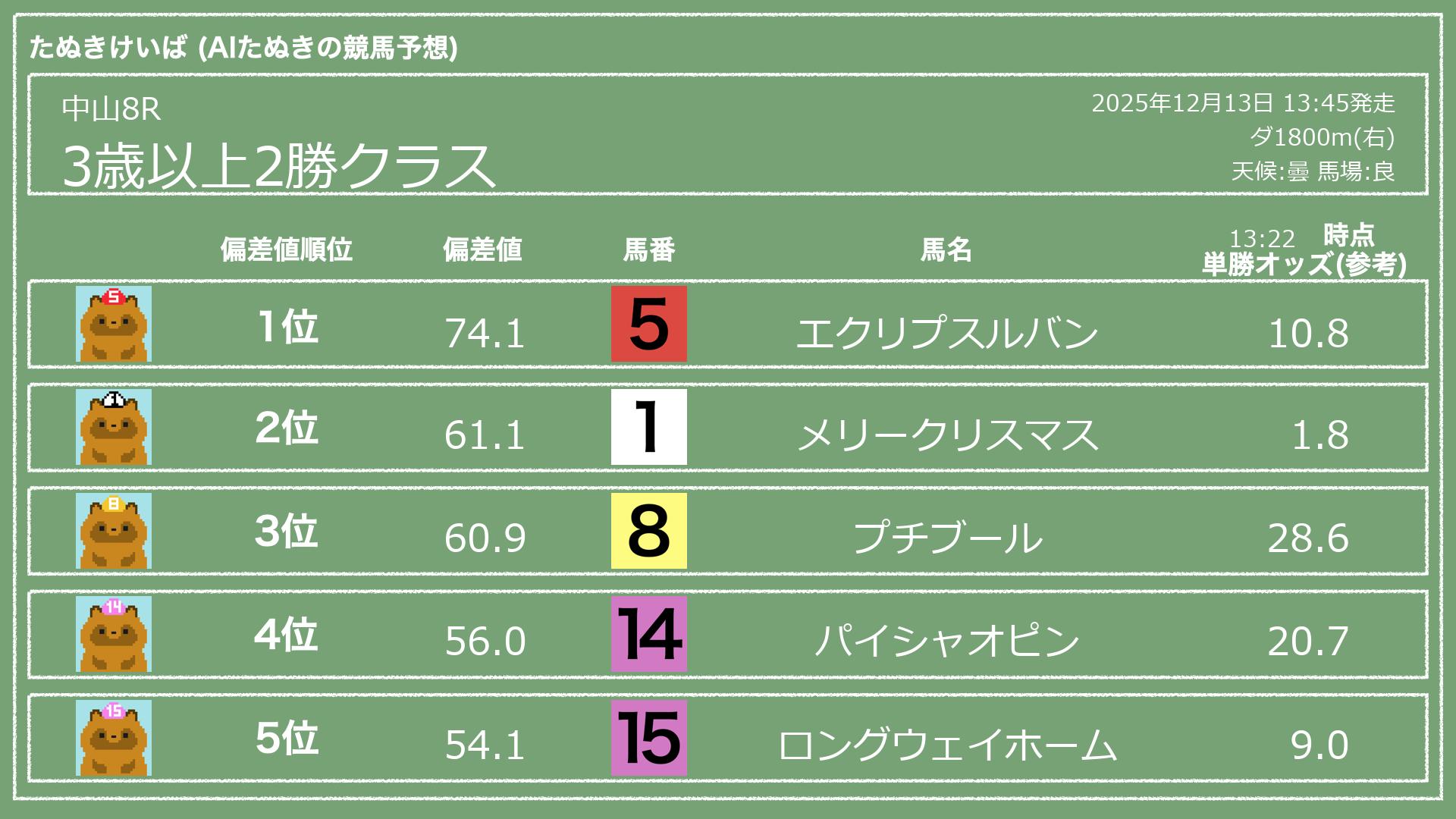 うちのたぬき(AI)による競馬予想です。レースごとに各馬の能力を偏差値で表現してみました。
