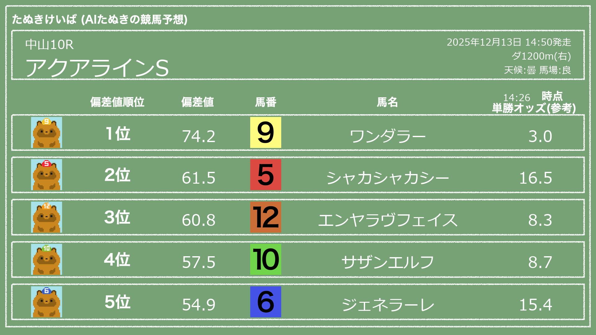 うちのたぬき(AI)による競馬予想です。レースごとに各馬の能力を偏差値で表現してみました。